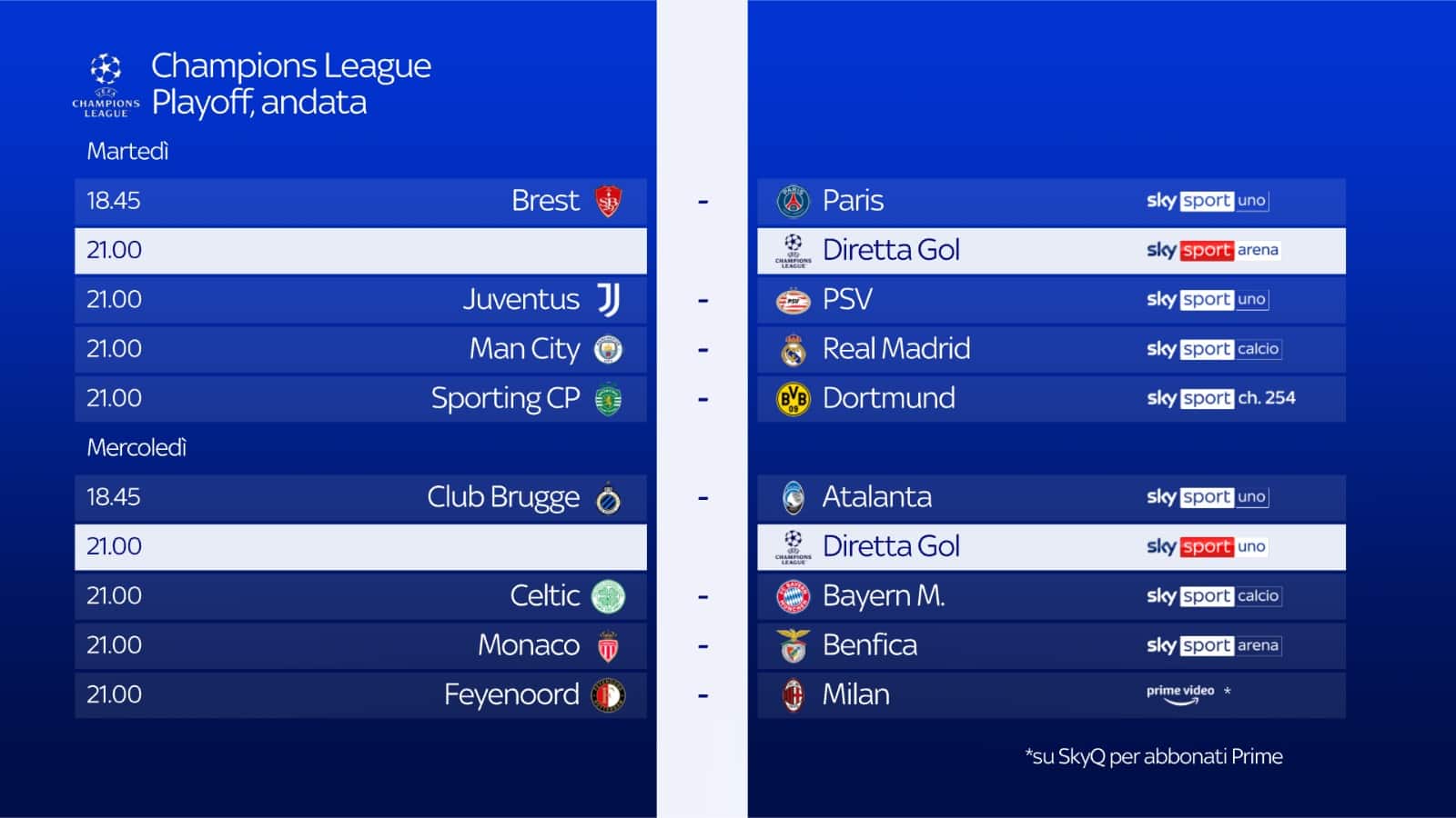Il mercoledì di Champions League, per l’andata dei playoff sarà live su Sky Sport e in streaming su NOW. Alle 18.45, scende in campo l’Atalanta, ospite del Club Brugge, in diretta su Sky Sport Uno, Sky Sport 251 e in streaming su NOW. Alle 21.00 altri due incontri: Celtic-Bayern Monaco, in diretta su Sky Sport Calcio, Sky Sport 252 e NOW e Monaco-Benfica su Sky Sport Arena, Sky Sport 253 e NOW. Alle 21.00 anche Feyenoord-Milan: i clienti Sky abbonati al servizio Amazon Prime potranno vedere il match in modo semplice e diretto attraverso l'app Prime Video disponibile su Sky Q, Sky Stream e Sky Glass.