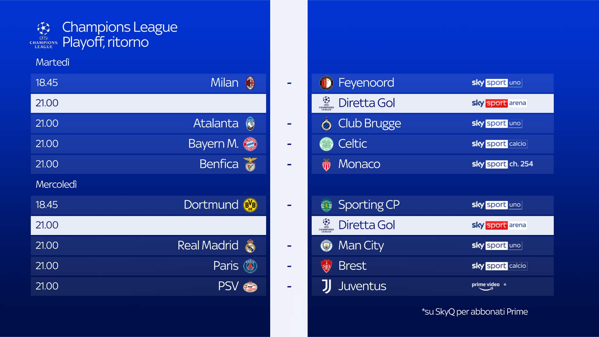 Oggi alle ore 21 l'Atalanta affronta in casa il Bruges, nel ritorno dei playoff di Champions League, partita da seguire in diretta su in diretta su Sky Sport Uno, Sky Sport 252, Sky Sport 4K e in streaming su NOW. Telecronaca Massimo Marianella, commento Giancarlo Marocchi, a bordocampo Massimiliano Nebuloni e Marina Presello. Inoltre, appuntamento con 'Champions League Show' dalle 18 e dalle 20. In studio: Federica Masolin in compagnia di Fabio Capello, Paolo Condò, Alessandro Costacurta e Zvonimir Boban. Mario Giunta per le news. Alle 21 appuntamento anche con Diretta Gol, su Sky Sport Arena, per seguire le partite in contemporanea.