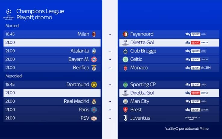 Si torna in campo in Europa con la Champions League. Oggi, mercoledì 19 febbraio, il ritorno dei playoff della massima competizione europea per club sarà live su Sky Sport e in streaming su NOW, con la possibilità di seguire tutte le partite anche in contemporanea grazie a Diretta Gol. Questa sera, alle 18.45, si inizia con lo Sporting Lisbona, ospite del Borussia Dortmund, in diretta su Sky Sport Uno, Sky Sport 254 e in streaming su NOW. Alle 21.00 altri due incontri: il big match Real Madrid-Manchester City su Sky Sport Uno, Sky Sport Calcio, Sky Sport 252, Sky Sport 4K e NOW, Paris Saint Germain-Brest, su Sky Sport 253 e NOW, e Diretta Gol su Sky Sport Max e NOW. Alle 21.00 anche PSV-Juventus: i clienti Sky abbonati al servizio Amazon Prime potranno vedere il match in modo semplice e diretto attraverso l'app Prime Video disponibile su Sky Q, Sky Stream e Sky Glass.