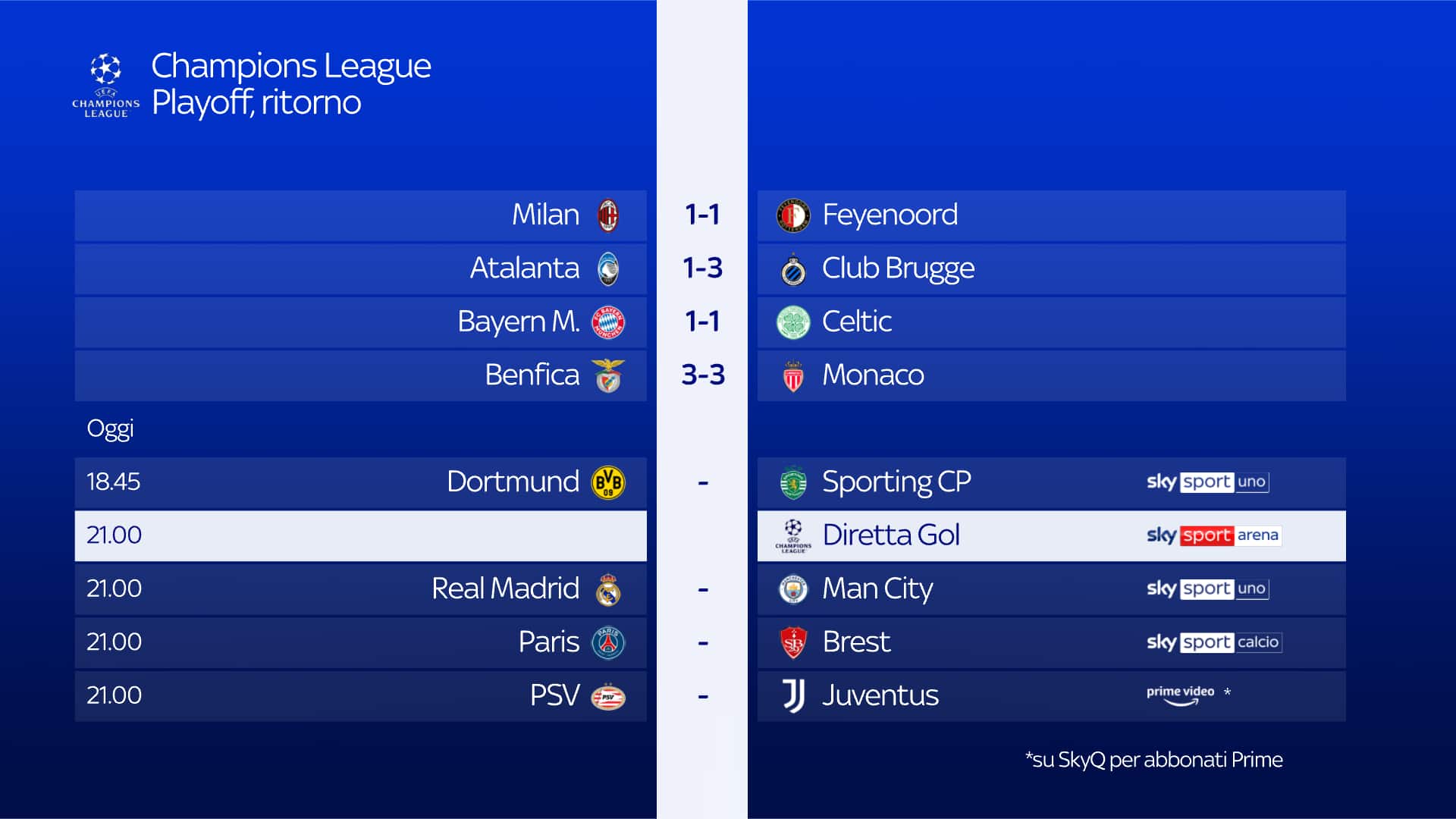 guida tvRitorno dei playoff di Champions League. Oggi alle 21 la Juve scende in campo contro il Psv: i clienti Sky abbonati al servizio Amazon Prime potranno vedere il match in modo semplice e diretto attraverso l'app Prime Video disponibile su Sky Q, Sky Stream e Sky Glass. Su Sky Sport ampio spazio all'approfondimento pre e postpartita con Champions League Show