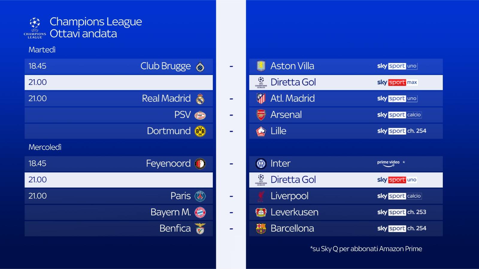 Si torna in campo in Europa con la Champions League. Mercoledì 5 marzo alle 21.00 tre partite: il big match Paris Saint Germain-Liverpool, Sky Sport Calcio, Sky Sport 252 e NOW, la sfida tutta tedesca fra Bayern Monaco e Bayer Leverkusen, in diretta su Sky Sport 253 e NOW, Benfica-Barcellona, Sky Sport 254 e NOW, e Diretta Gol su Sky Sport Uno, Sky Sport 251 e NOW. Alle 18.45 anche Feyenoord-Inter: i clienti Sky abbonati al servizio Amazon Prime potranno vedere il match in modo semplice e diretto attraverso l'app Prime Video disponibile su Sky Q, Sky Stream e Sky Glass.