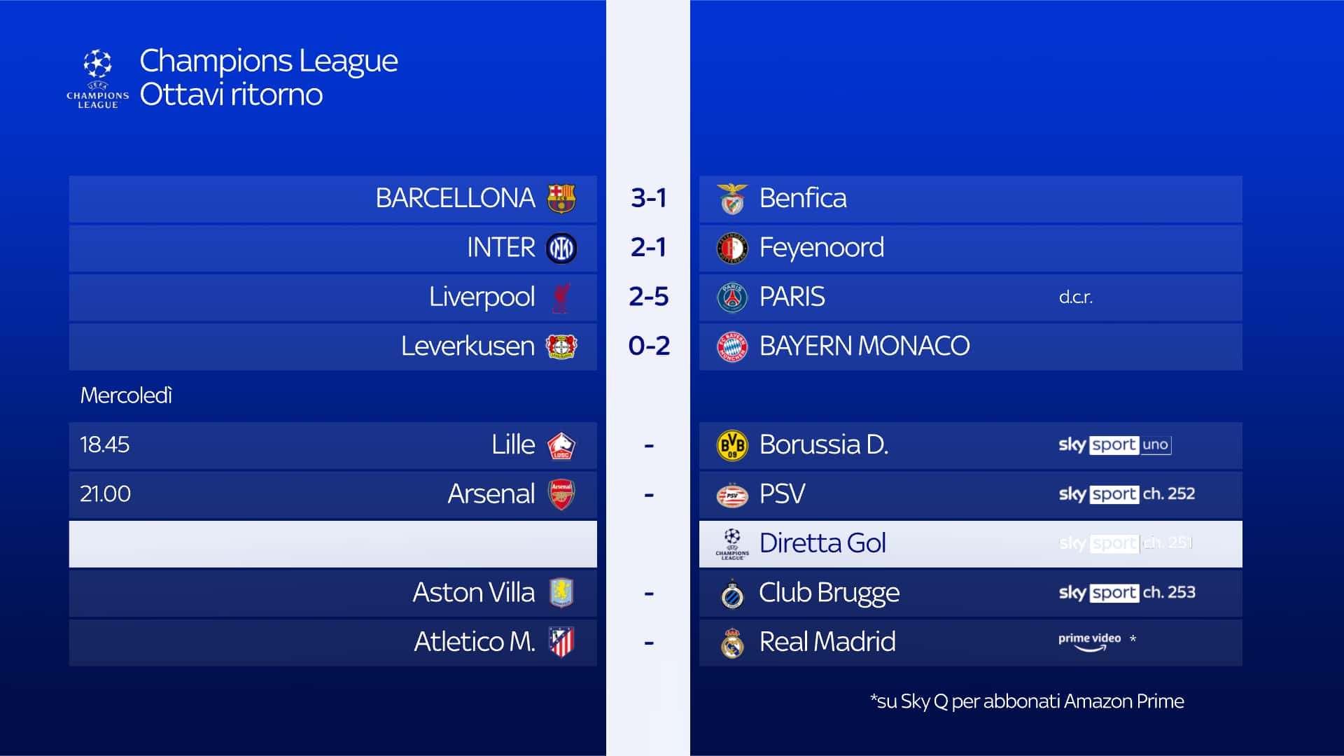guida tvRitorno degli ottavi di Champions League. Oggi alle 21 appuntamento con Atletico Madrid-Real Madrid. I clienti Sky abbonati al servizio Amazon Prime potranno vedere il match in modo semplice e diretto attraverso l'app Prime Video disponibile su Sky Q, Sky Stream e Sky Glass. Su Sky Sport ampio spazio all'approfondimento pre e postpartita con Champions League Show