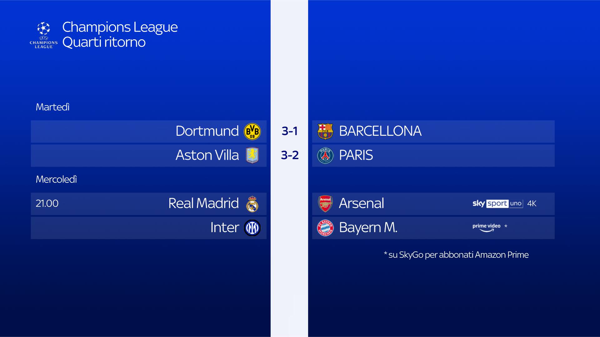 guida tvRitorno dei quarti di Champions League: oggi alle 21 appuntamento con Inter-Bayern Monaco. I clienti Sky abbonati al servizio Amazon Prime potranno vedere il match in modo semplice e diretto attraverso l'app Prime Video disponibile su Sky Q, Sky Stream e Sky Glass. Su Sky Sport ampio spazio all'approfondimento pre e postpartita con Champions League Show dalle 19.30