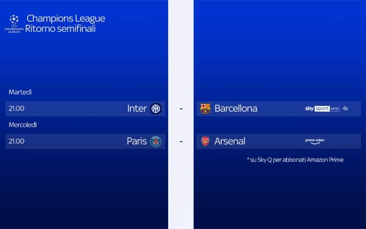 Si torna in campo in Europa con la Champions League. Martedì 6 e mercoledì 7 maggio il ritorno delle semifinali della massima competizione europea per club sarà live su Sky Sport e in streaming su NOW. Domani, alle 21.00, a San Siro l’Inter cerca il pass per la finale contro il Barcellona dopo il pirotecnico match di andata. Sky seguirà l’avvicinamento al match minuto per minuto già dalla mattina su Sky Sport 24, con i collegamenti degli inviati dallo stadio e da Appiano Gentile, con costanti aggiornamenti sulle scelte di Simone Inzaghi e Hans-Dieter Flick dai rispettivi ritiri. Mercoledì, alle 21.00, anche PSG-Arsenal: i clienti Sky abbonati al servizio Amazon Prime potranno vedere il match in modo semplice e diretto attraverso l'app Prime Video disponibile su Sky Q, Sky Stream e Sky Glass.