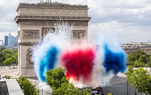- La parata porta i neo-campioni sotto l'Arco di Trionfo e il cielo sopra di loro si colora di blu, bianco e rosso.
