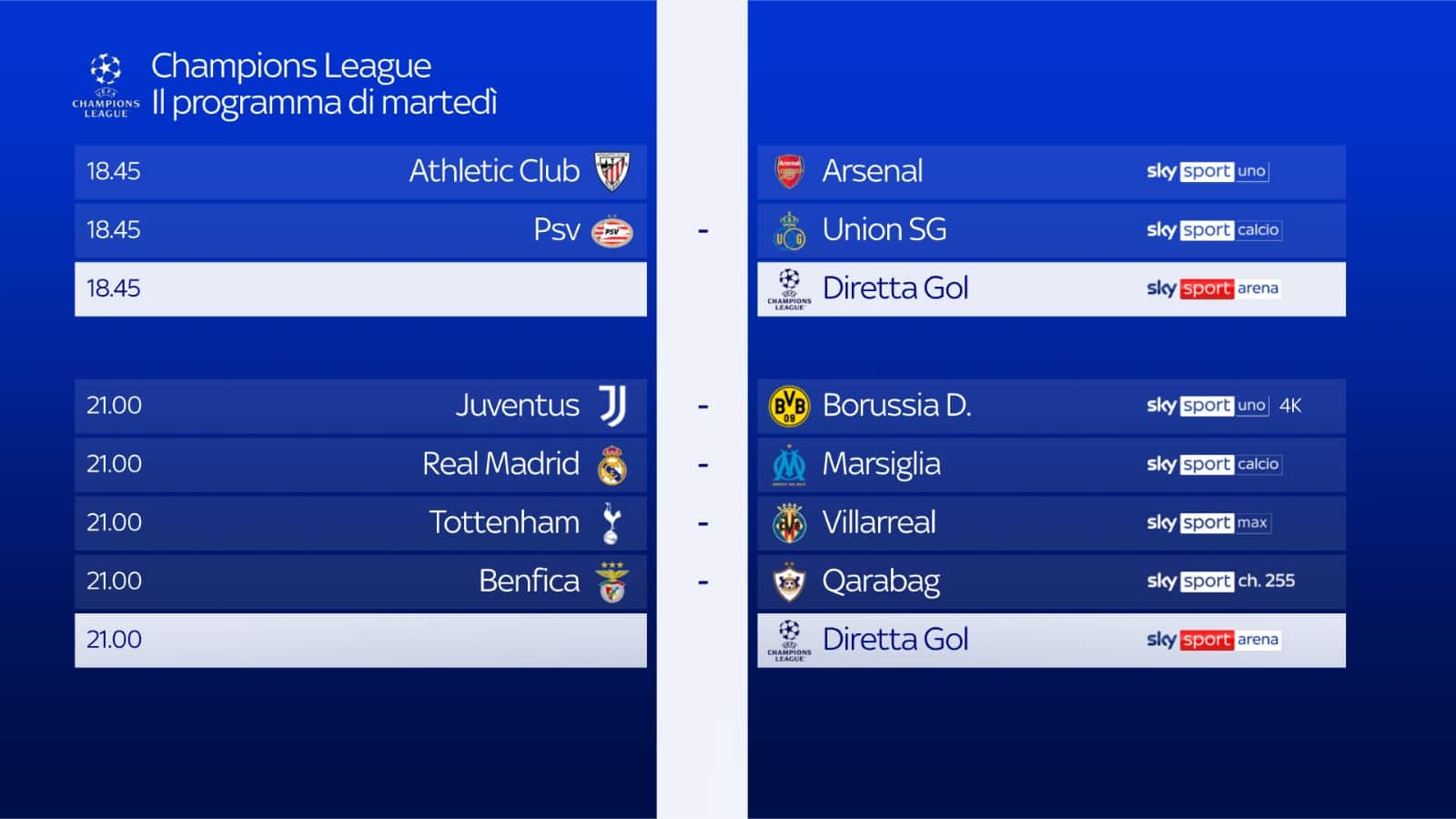 - ore 21.00: Diretta Gol su Sky Sport Arena, Sky Sport 251 e in streaming su NOW