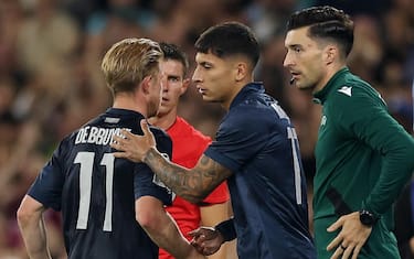 Dopo i cori e gli striscioni del pre partita il ritorno di Kevin De Bruyne all'Etihad è durato solo 26 minuti. Il grande ex di City-Napoli è stato sostituito poco dopo la metà del primo tempo: una mossa tattica di Conte dopo l'espulsione di Di Lorenzo che ha costretto i campioni d'Italia a giocare in 10 il resto del match. Di seguito le immagini del 'fugace' ritorno di KDB in quella che è stata la sua casa negli ultimi 10 anni