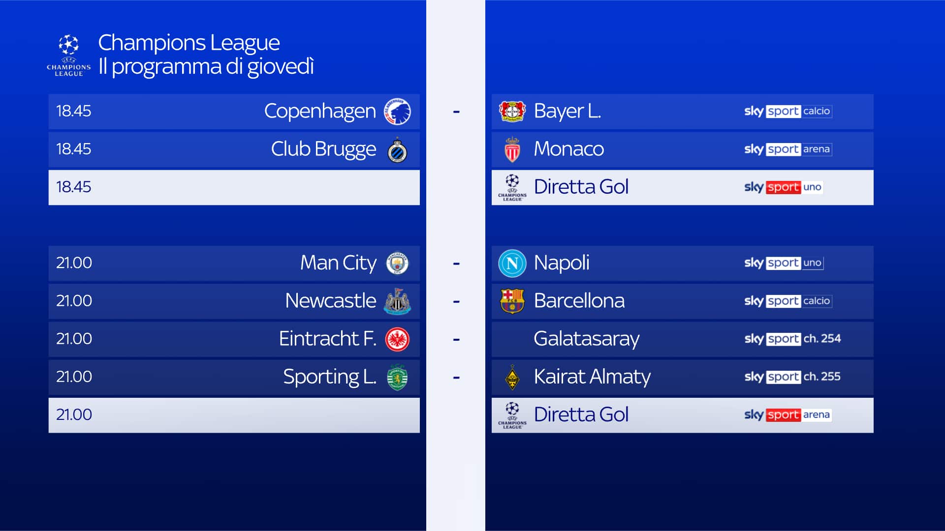 Oggi alle ore 21 inizia l'avventura in Champions del Napoli che affronta il Man City nella prima giornata di Champions League, partita da seguire in diretta su su Sky Sport Uno, Sky Sport 252 e in streaming su NOW. Telecronaca Fabio Caressa, commento Giuseppe Bergomi; a bordocampo Gianluigi Bagnulo, Francesco Modugno e Massimiliano Ugolini. Diretta Gol con Riccardo Gentile. Inoltre, appuntamento con 'Champions League Show' dalle 17.30 alle 18.35 con Sara Benci e Paolo Di Canio. Poi dalle 20 e dalle 23 con Mario Giunta in compagnia di Paolo Condò, Faouzi Ghoulam, Alessandro Costacurta e Paolo Di Canio. Alle 18.45 su Sky Sport Uno e alle 21 su Sky Sport Arena, appuntamento anche con Diretta Gol, per seguire le partite in contemporanea.