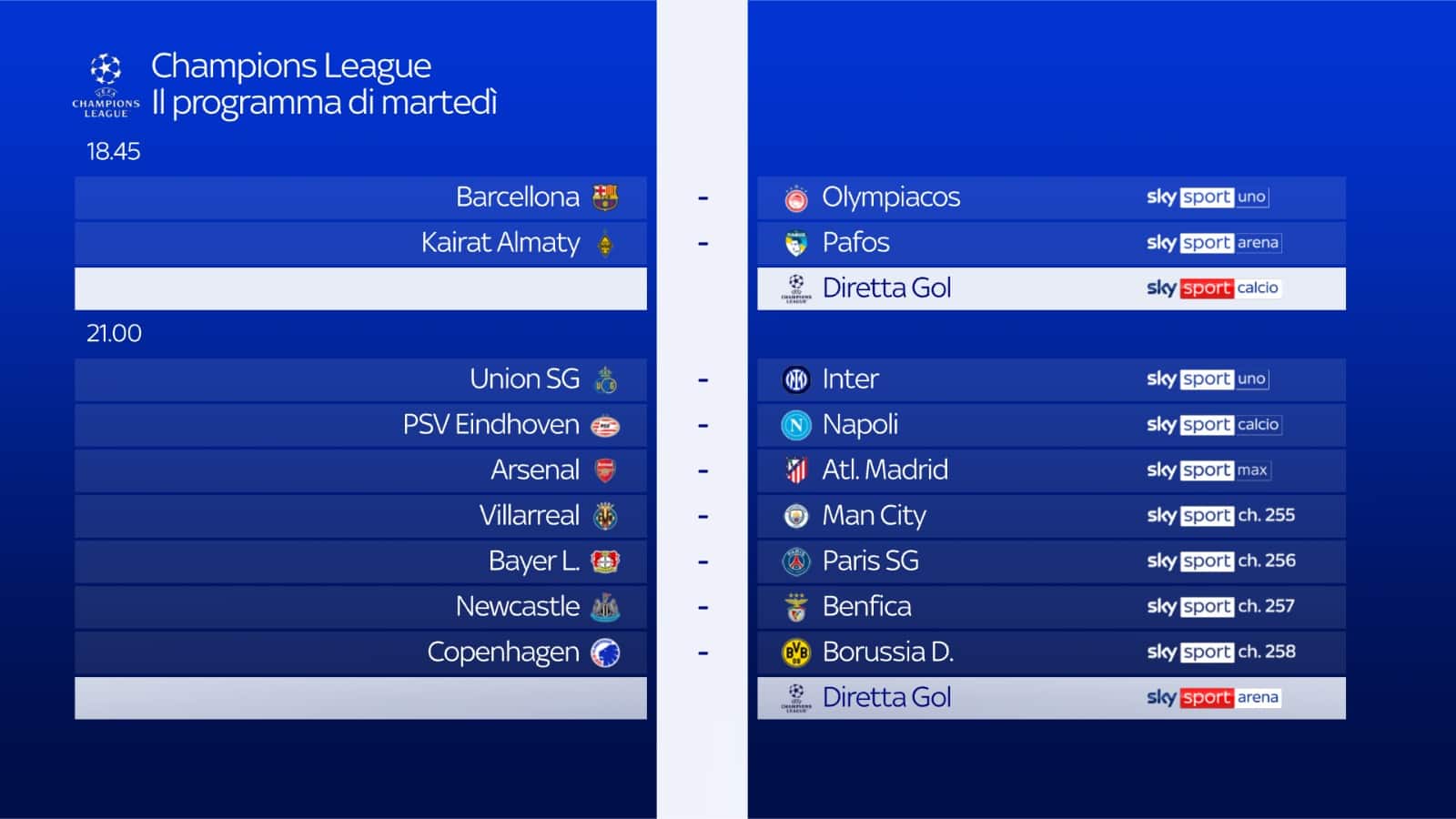 - ore 21.00: COPENAGHEN-BORUSSIA DORTMUND su Sky Sport 258 e in streaming su NOW. Telecronaca Christian Giordano, Diretta Gol Paolo Redi