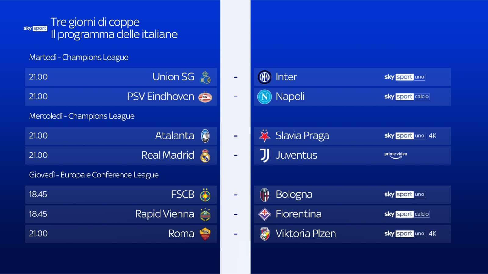Si torna in campo in Europa con la Champions League, tutta da vivere su Sky e in streaming su NOW con 185 partite su 203 in esclusiva fino alla finale di Budapest del 30 maggio 2026. Martedì 21 e mercoledì 22 ottobre, la terza giornata della massima competizione europea per club sarà live su Sky Sport con 17 partite da seguire anche in contemporanea grazie a Diretta Gol. Domani alle 21.00 in campo Union Saint-Gilloise-Inter (Sky Sport Uno e Sky Sport 252) e PSV Eindhoven-Napoli (Sky Sport Calcio e Sky Sport 253). Mercoledì alle 21.00, appuntamento alla New Balance Arena di Bergamo con la sfida tra Atalanta e Slavia Praga (Sky Sport Uno, Sky Sport 252 e Sky Sport 4K). Alla stessa ora anche Real Madrid-Juventus: i clienti Sky abbonati al servizio Amazon Prime potranno vedere il match in modo semplice e diretto attraverso l'app Prime Video disponibile su Sky Q, Sky Stream e Sky Glass.