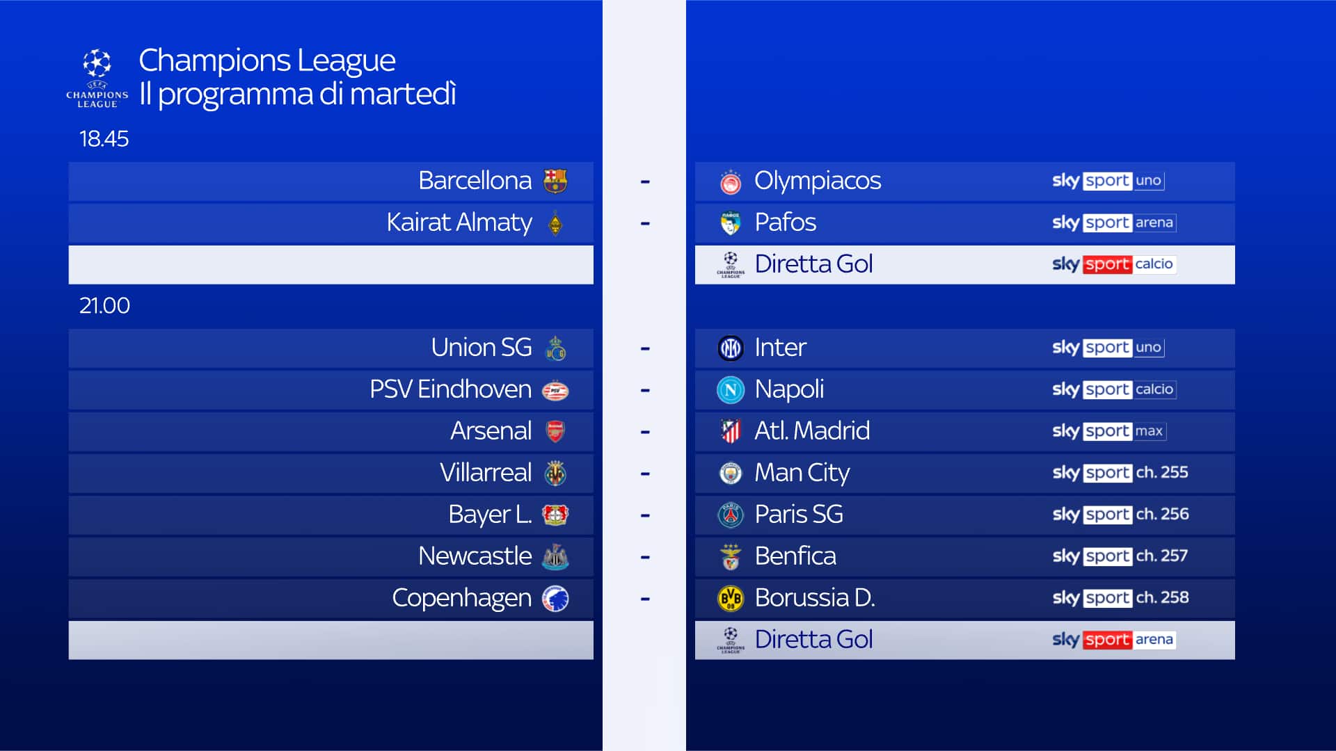 Oggi alle ore 21 terza giornata di Champions dell'Inter che affronta in trasferta l'Union Saint Gilloise, partita da seguire in diretta su Sky Sport Uno, Sky Sport 252 e in streaming su NOW. Telecronaca Maurizio Compagnoni, commento Luca Marchegiani; a bordocampo Andrea Paventi e Matteo Barzaghi. Diretta Gol con Riccardo Gentile. Inoltre, appuntamento con 'Champions League Show' dalle 18 alle 18.35 con Sara Benci e Paolo Condò. Poi dalle 20 e dalle 23 con Mario Giunta in compagnia di Fabio Capello, Paolo Condò, Zvonimir Boban, Goran Pandev e Faouzi Ghoulam. Alle 18.45 su Sky Sport Calcio e Sky Sport 251 e alle 21 (Sky Sport Arena e Sky Sport 251) appuntamento anche con Diretta Gol, per seguire le partite in contemporanea.