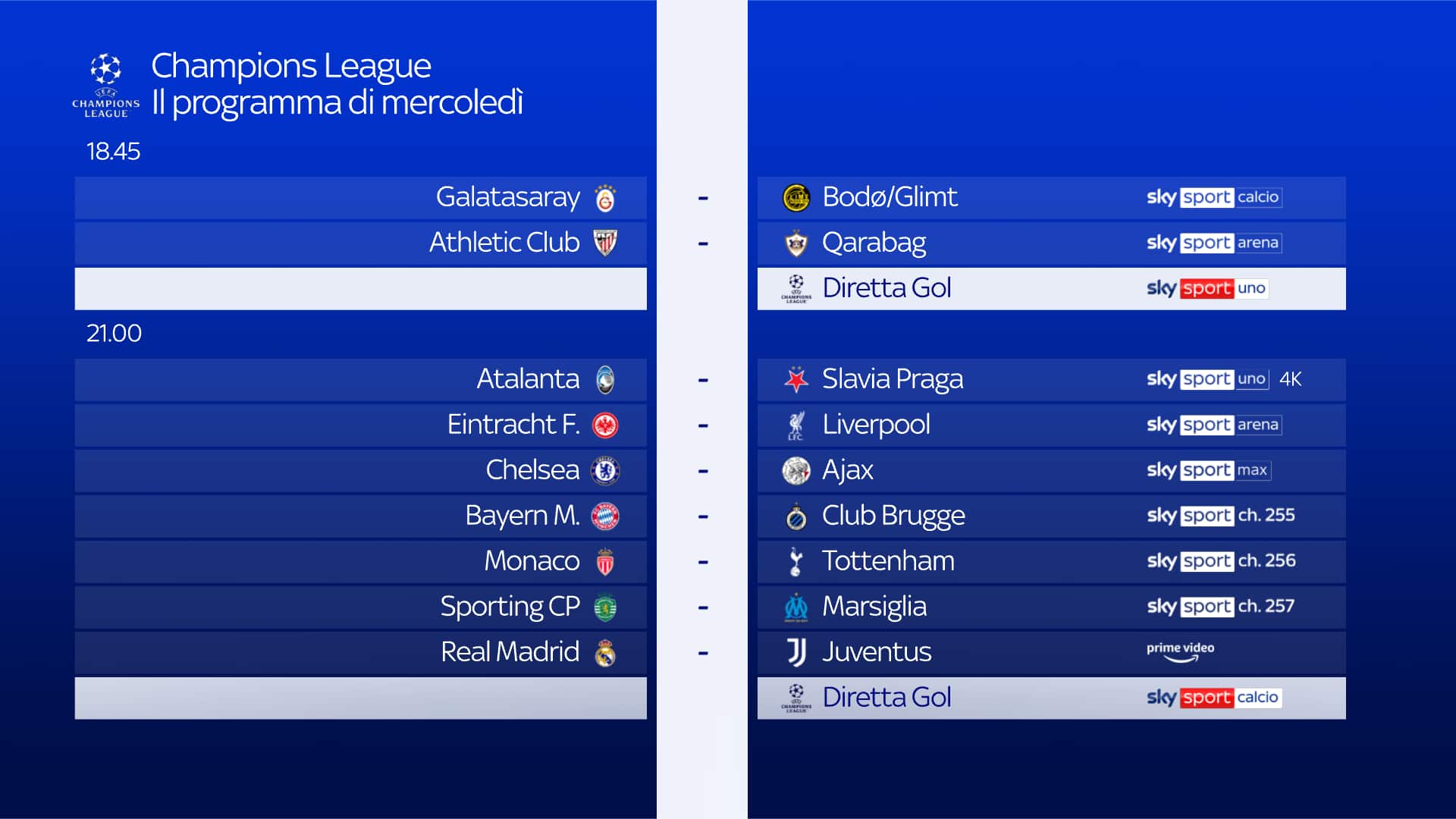 Oggi alle ore 21 terza giornata di Champions dell'Atalanta che affronta in casa lo Slavia Praga, partita da seguire in diretta su Sky Sport Uno, Sky Sport 4K, Sky Sport 252 e in streaming su NOW. Telecronaca Fabio Caressa, commento Giuseppe Bergomi; a bordocampo Massimiliano Nebuloni e Marina Presello. Diretta Gol con Riccardo Gentile. Inoltre, appuntamento con 'Champions League Show' dalle 18 alle 18.35 con Sara Benci e Alessandro Costacurta. Poi dalle 20 e dalle 23 con Mario Giunta in compagnia di Fabio Capello, Paolo Condò, Paolo Di Canio, Michele Padovano e Alessandro Del Piero collegato da Madrid. Alle 18.45 su Sky Sport Uno e Sky Sport 251 e alle 21 (Sky Sport Calcio e Sky Sport 251) appuntamento anche con Diretta Gol, per seguire le partite in contemporanea.