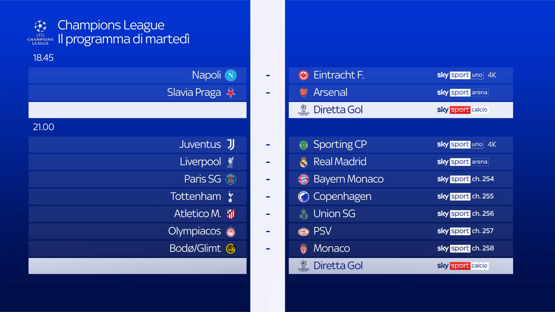 guida tvOggi alle ore 18.45 il Napoli affronta in casa l'Eintracht Francoforte, partita da seguire in diretta su Sky Sport Uno, Sky Sport 4K, Sky Sport 253 e in streaming su NOW. Ampio spazio all’approfondimento pre e post partita con Champions League Show