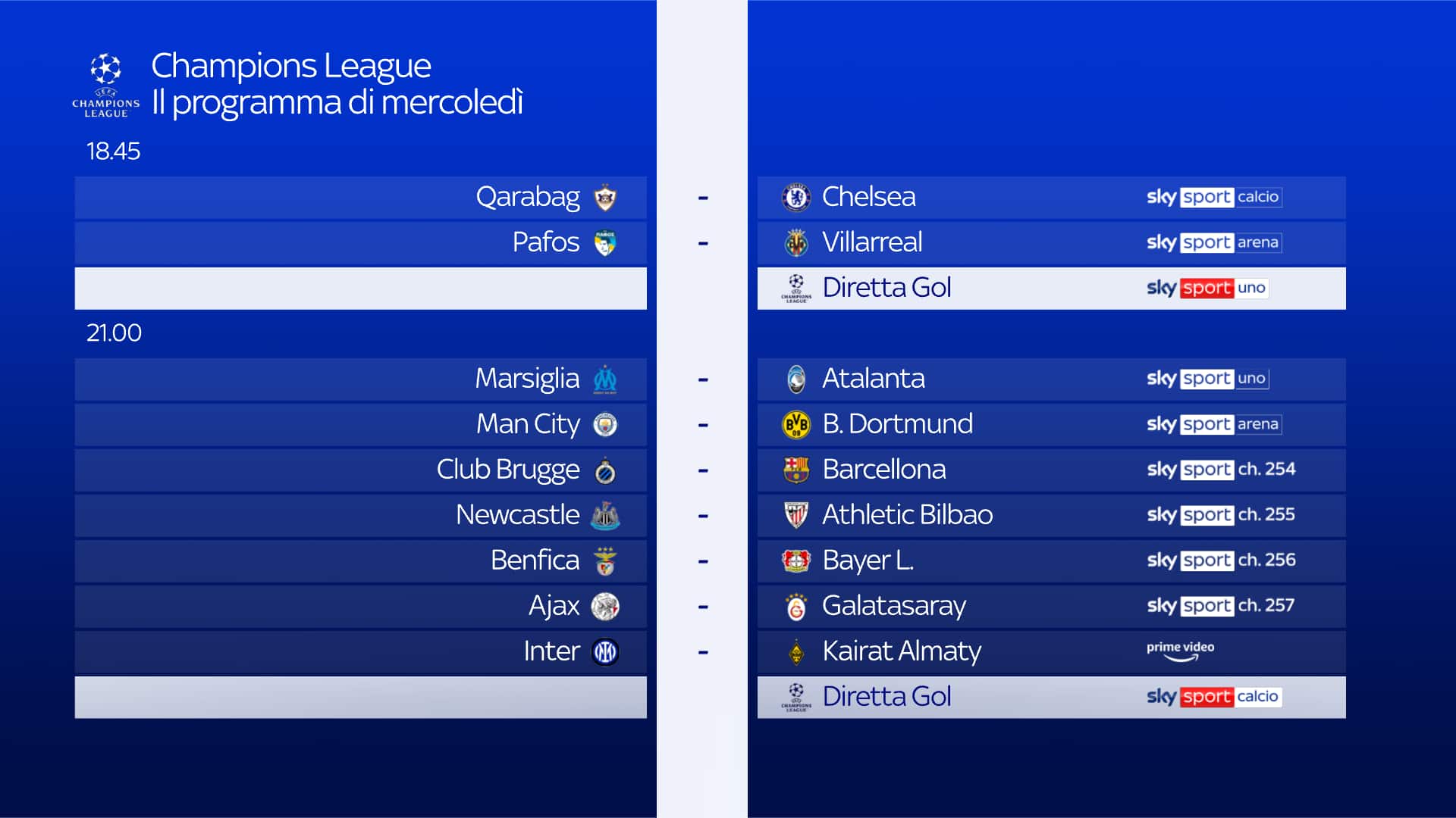 Da non perdere oggi alle 21, la quarta giornata di Champions League con l'Inter impegnata in casa contro i kazaki del Kairat: i clienti Sky abbonati al servizio Amazon Prime potranno vedere il match in modo semplice e diretto attraverso l'app Prime Video disponibile su Sky Q, Sky Stream e Sky Glass. Inoltre, appuntamento con 'Champions League Show' dalle 18 alle 18.35 con Sara Benci e Paolo Condò. Poi dalle 20 e dalle 23 con Mario Giunta in compagnia di Fabio Capello, Paolo Condò, Alessandro Costacurta, Paolo Di Canio e Goran Pandev. Alle 18.45 ( su Sky Sport Uno e Sky Sport 251) e alle 21 su Sky Sport Calcio e Sky Sport 251 appuntamento anche con Diretta Gol, per seguire le partite in contemporanea.