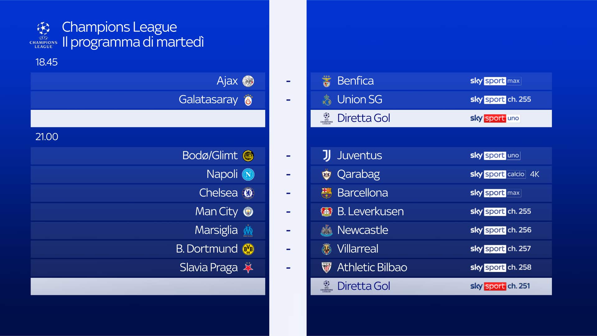 guida tvOggi alle ore 21 la Juventus affronta in trasferta il Bodo Glimt, partita da seguire in diretta su Sky Sport Uno, Sky Sport 252 e in streaming su NOW. Ampio spazio all’approfondimento pre e post partita con Champions League Show e il ritorno di Federica Masolin per i pre e postpartita serali del martedì