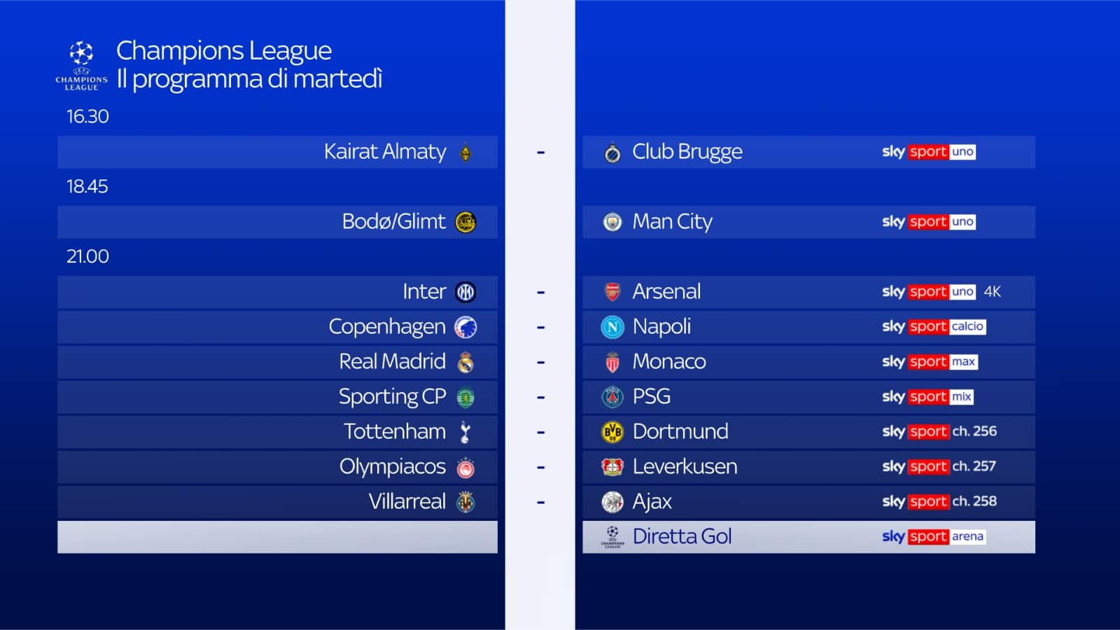 - alle 21.00: COPENHAGEN-NAPOLI su Sky Sport Calcio, Sky Sport 253 e in streaming su NOW. Telecronaca Riccardo Gentile, commento Aldo Serena, inviati Massimo Ugolini e Gianluigi Bagnulo, Diretta Gol Dario Massara