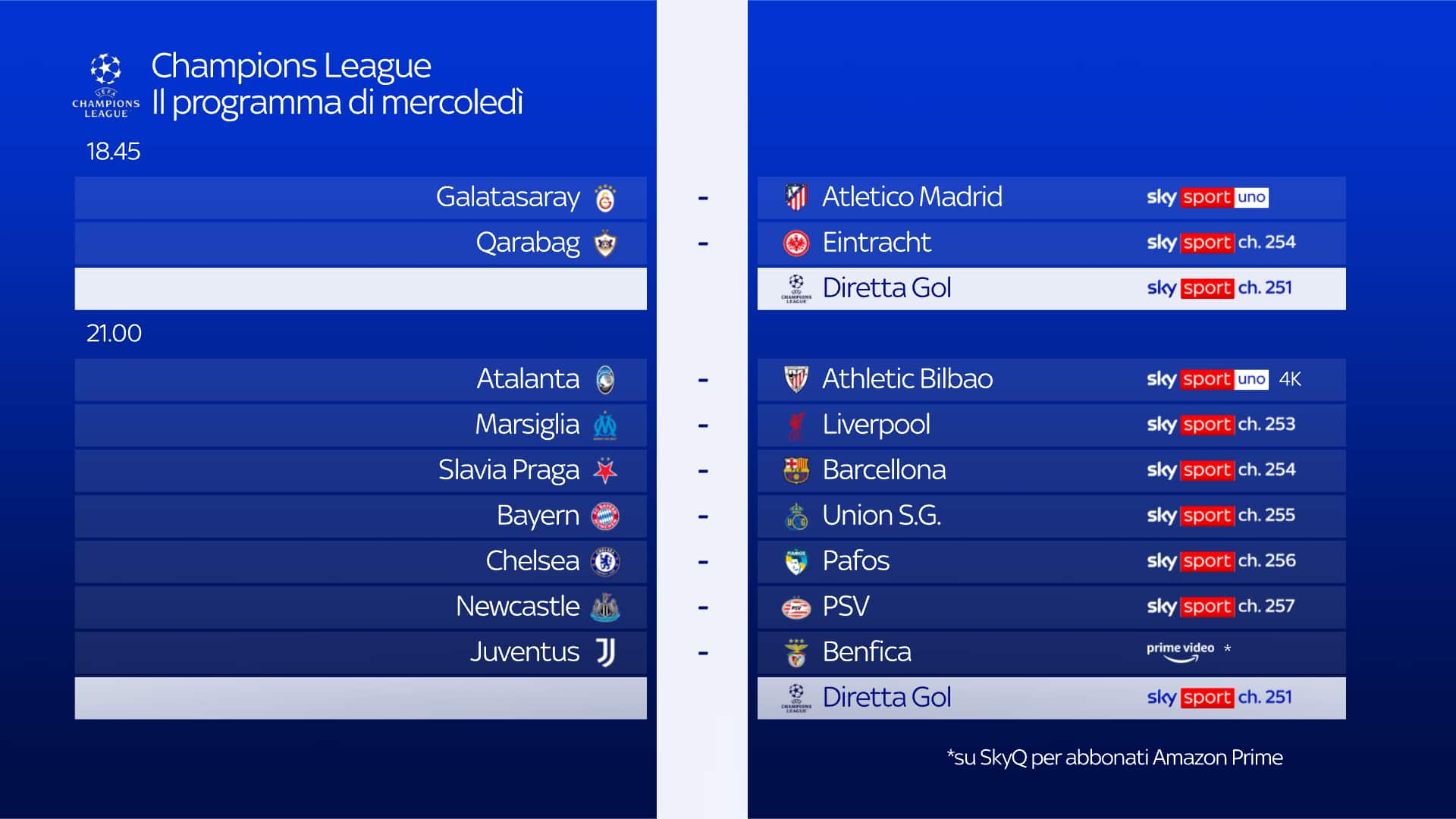 Da non perdere oggi alle 21, la settima giornata di Champions League con la Juve impegnata contro il Benfica: i clienti Sky abbonati al servizio Amazon Prime potranno vedere il match in modo semplice e diretto attraverso l'app Prime Video disponibile su Sky Q, Sky Stream e Sky Glass. Inoltre, appuntamento con 'Champions League Show' dalle 18 alle 18.35 con Mario Giunta e Alessandro Costacurta. Poi dalle 20 e dalle 23 con Federica Masolin in compagnia di Paolo Condò, Fabio Capello, Alessandro Costacurta, Alessandro Del Piero, Paolo Di Canio e Mario Giunta. Chiude la serata Goleador Europe, con Martina Quaranta. Alle 18.45 e alle 21 (su Sky Sport 251 e in streaming su NOW) appuntamento anche con Diretta Gol, per seguire le partite in contemporanea.