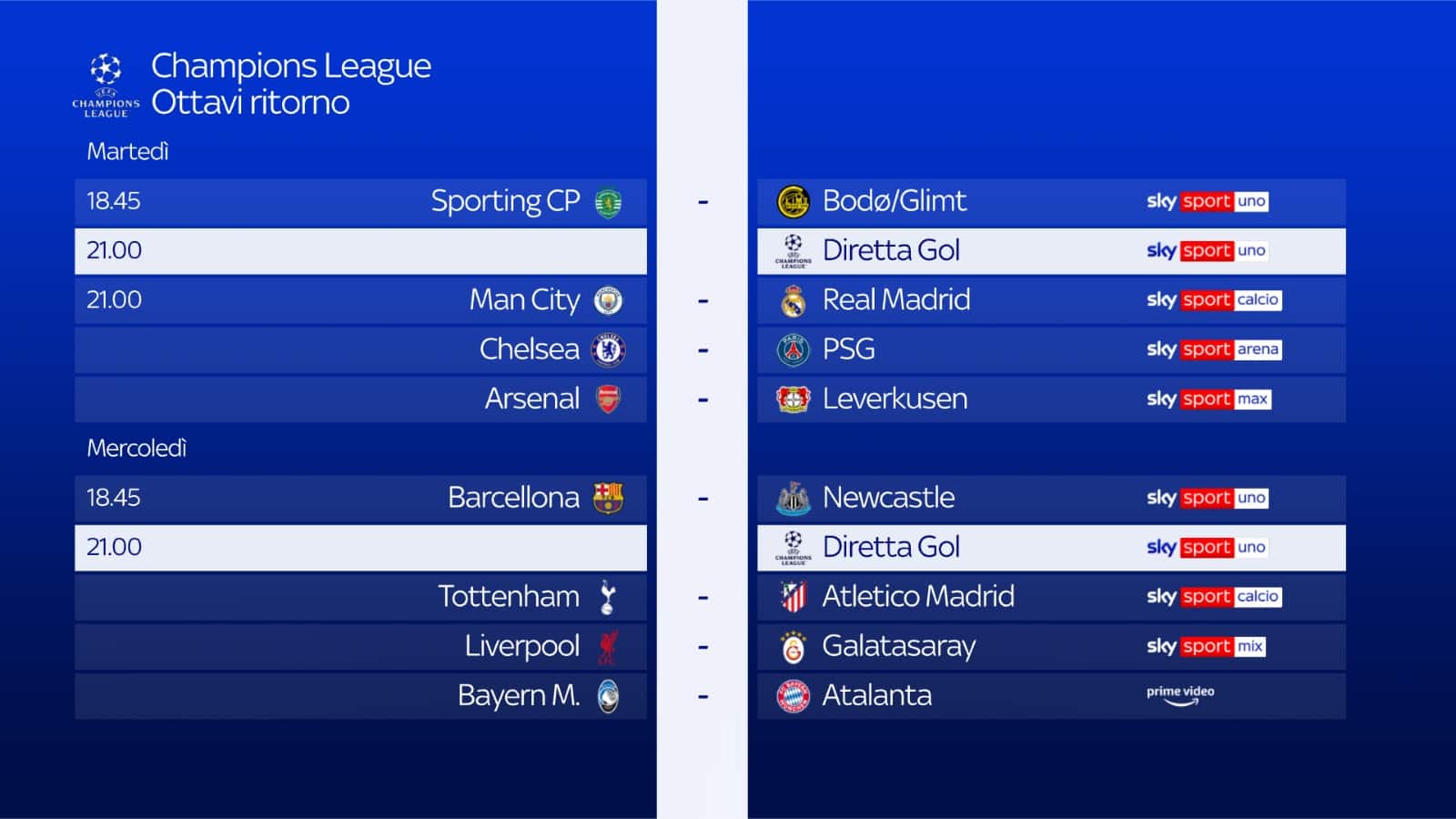 Mercoledì 18 marzo, il ritorno degli ottavi di finale di Champions League, su Sky e in streaming su NOW, con le partite da seguire anche in contemporanea grazie a Diretta Gol. Alle 18.45 in scena il Barcellona, che ospiterà al Camp Nou il Newcastle, Sky Sport Uno e Sky Sport 254, mentre alle 21.00 in programma Liverpool-Galatasaray, Sky Sport Calcio e Sky Sport 252, e Tottenham-Atletico Madrid, Sky Sport Mix e Sky Sport 253. Sempre mercoledì alle 21.00 in campo Bayern Monaco-Atalanta: i clienti Sky abbonati al servizio Amazon Prime potranno vedere il match in modo semplice e diretto attraverso l'app Prime Video disponibile su Sky Q, Sky Stream e Sky Glass.