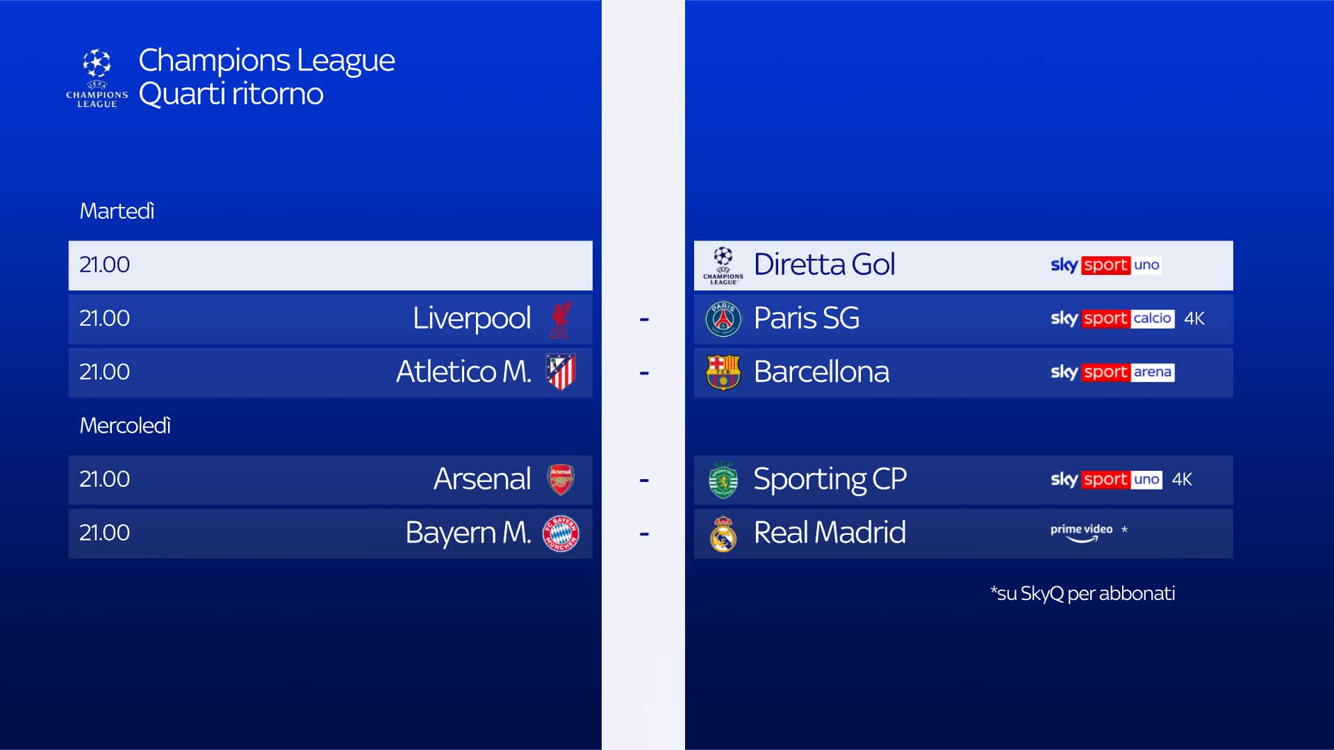 Da non perdere oggi alle 21 il ritorno dei quarti di finale di Champions League con il Liverpool impegnato in casa contro il Psg: partita da seguire in diretta su Sky Sport Arena, Sky Sport 252 e Sky Sport 4K e in streaming su NOW. Telecronaca Nicola Roggero. Inviata Valentina Mariani. Diretta Gol con Federico Zancan. Ampio spazio all’approfondimento pre e postpartita- dalle 20 e dalle 23- con Champions League Show, con Federica Masolin alla conduzione e Mario Giunta alle news. In studio, insieme a Paolo Condò e Fabio Capello, saranno presenti Alessandro Costacurta e Zvonimir Boban. Gli stessi ospiti si ritroveranno in After Party, mentre chiude la serata Goleador Europe, con Martina Quaranta. Inoltre, alle 21 appuntamento con Diretta Gol su Sky Sport Uno, Sky Sport, Sky Sport 251 e in streaming su NOW.