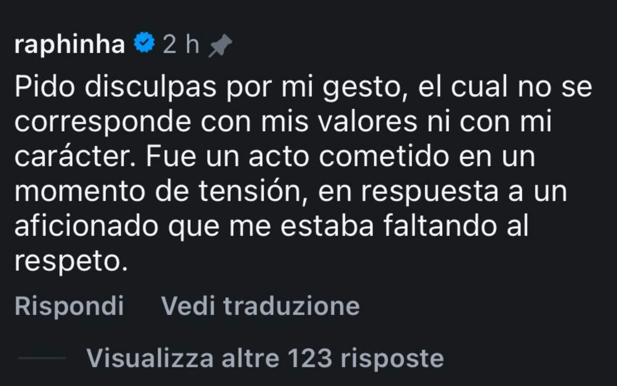 A proposito del gesto, il giocatore brasiliano si è poi scusato nel day after con un commento su Instagram in risposta al video 'incriminato'. Raphinha ha scritto: "Chiedo scusa per il mio gesto, che non corrisponde nè ai miei valori nè al mio carattere. È stato un gesto commesso in un momento di tensione, in risposta a un tifoso che mi stava mancando di rispetto".
