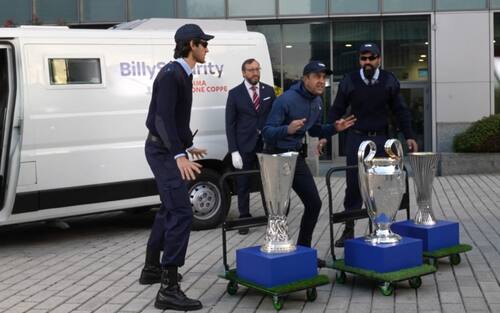 Grazie all'ex difensore le Coppe, arrivate per l'occasione nella sede di Sky, a Milano, sono in ottime mani...