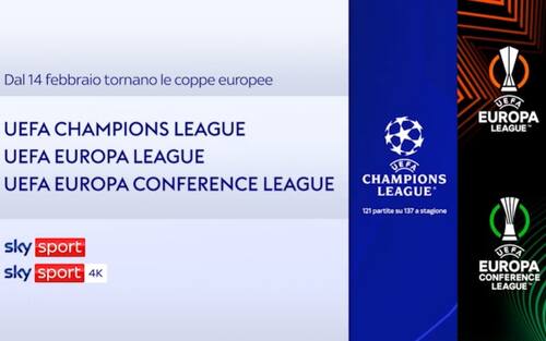 Tornano Champions, Europa League e Conference. Sette le italiane in campo e quattro giorni di grande calcio. Dal 14 febbraio ripartono le coppe europee, da seguire in diretta su Sky Sport e in streaming su NOW