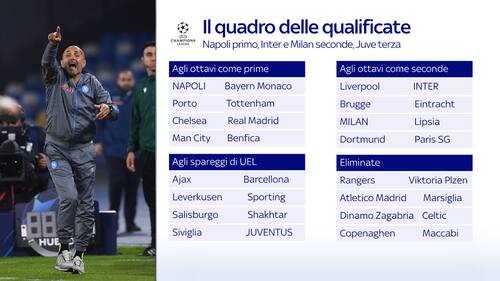 Si è chiusa la fase a gironi della Champions, che registra la qualificazione agli ottavi di un'altra italiana dopo Napoli e Inter. È il Milan di Pioli, che batte 4-0 il Salisburgo e passa il turno nel gruppo E alle spalle del Chelsea. In precedenza anche il Lipsia si era unito alle 16 squadre ammesse alla fase ad eliminazione diretta. Lunedì 7 novembre il sorteggio sarà live alle 12 su Sky Sport 24 e in streaming su NOW e su skysport.it
