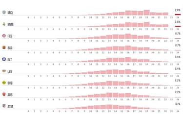 Per fare un esempio, la probabilità che il Manchester City chiuda a punteggio pieno (24 punti) è del 2,9%. Per il Real Madrid è del 2,6%. Per entrambe la quota più probabile risultata dalle simulazioni è 19 punti