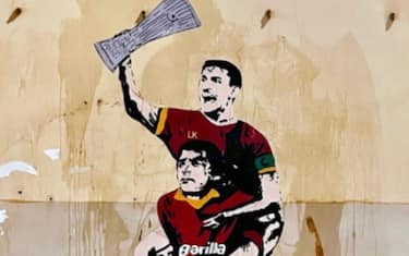 "Un calcio alle paure 1984-2022" è la nuova opera della street artist Laika, apparsa a Roma, nel quartiere Testaccio, la scorsa notte. Il poster raffigura "il compianto capitano" della Roma Agostino Di Bartolomei in festa, che porta sulle sue spalle il capitano della Roma del 2022, Lorenzo Pellegrini e tiene in mano la Coppa Conference League, appena vinta a Tirana dai giallorossi.