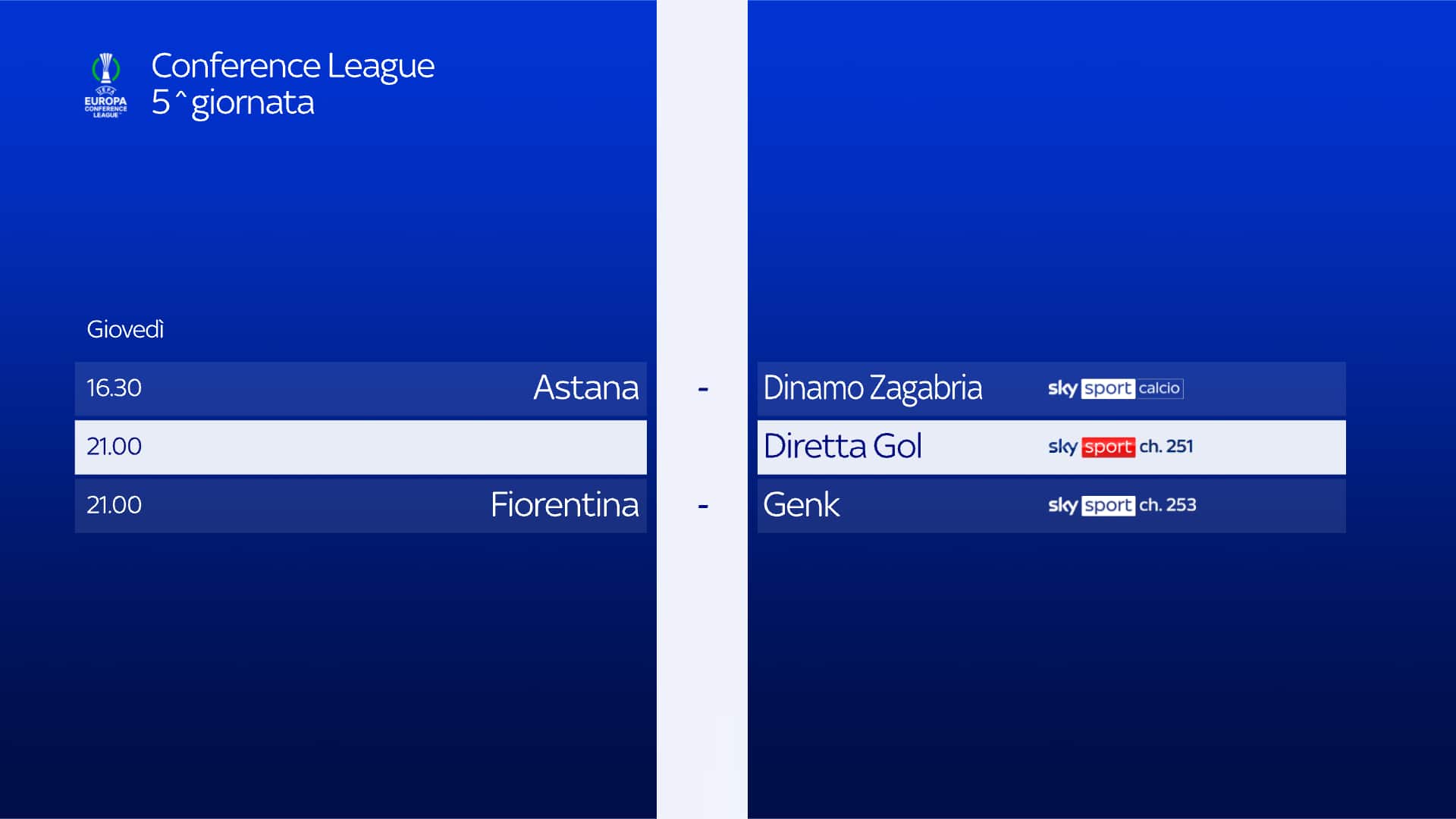 - Ore 21: Diretta Gol, Sky Sport 251 e NOW