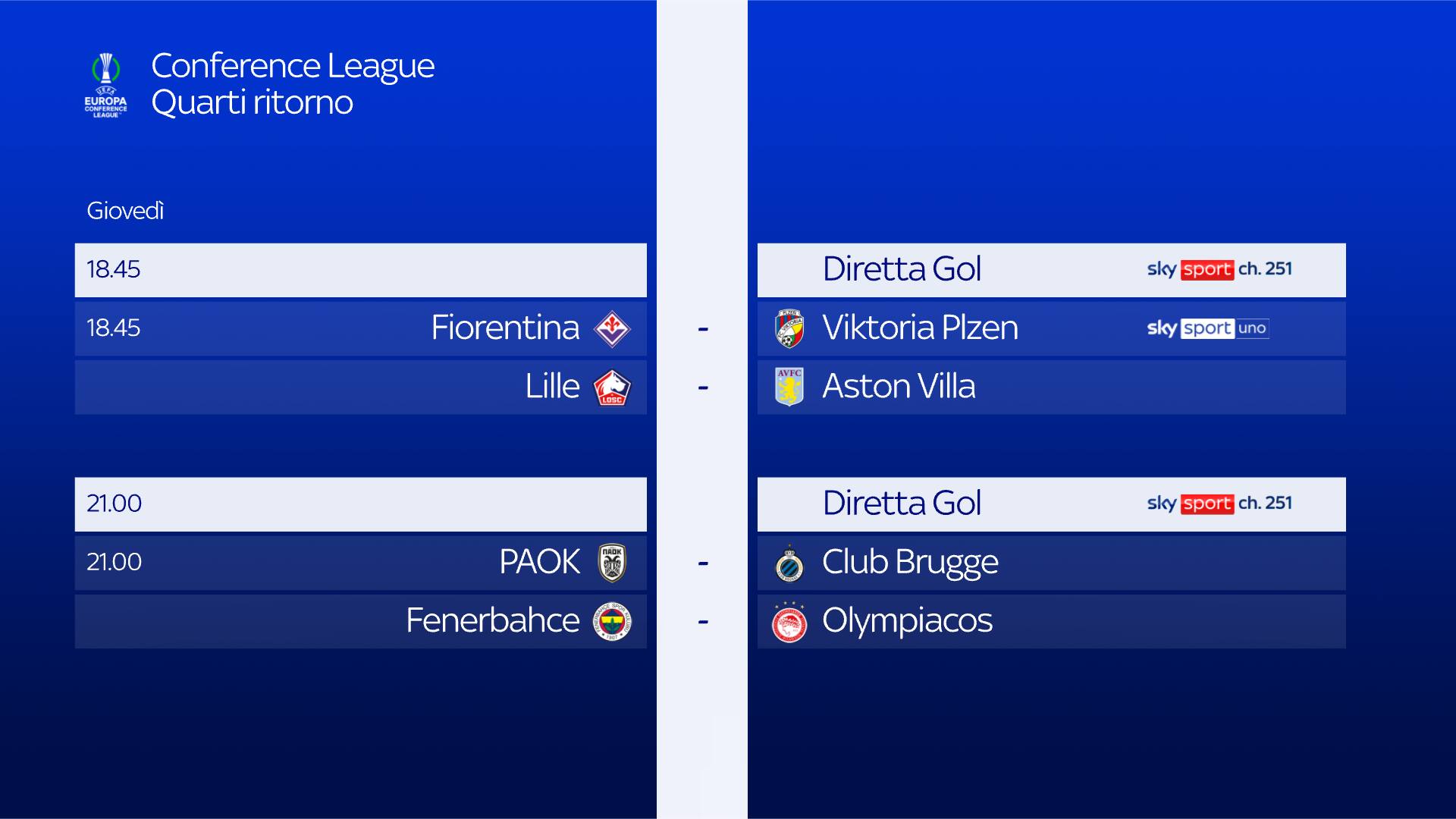 La partita tra Fiorentina e Viktoria Plzen, valida per il ritorno dei quarti di finale di Conference League, si gioca giovedì 18 aprile alle 18.45 e sarà in diretta su Sky Sport Uno, Sky Sport 254, Sky Sport 4K e in streaming su NOW. Telecronaca di Dario Massara con il commento di Nando Orsi. I collegamenti a bordocampo sono a cura di Vanessa Leonardi e Silvia Vallini. Su Sky Sport Uno, Sky Sport 24 e NOW, alle 18.00, studio pre partita con Leo Di Bello in conduzione; con lui Beppe Bergomi, Andrea Marinozzi, Stefano De Grandis e Margherita Cirillo. Su Sky Sport 24, studio in onda anche alle 20.00 per seguire il post partita. Appuntamento inoltre con Diretta Gol le alle 18.45 e 21 per seguire tutte le partite in contemporanea su Sky Sport 251 e NOW.