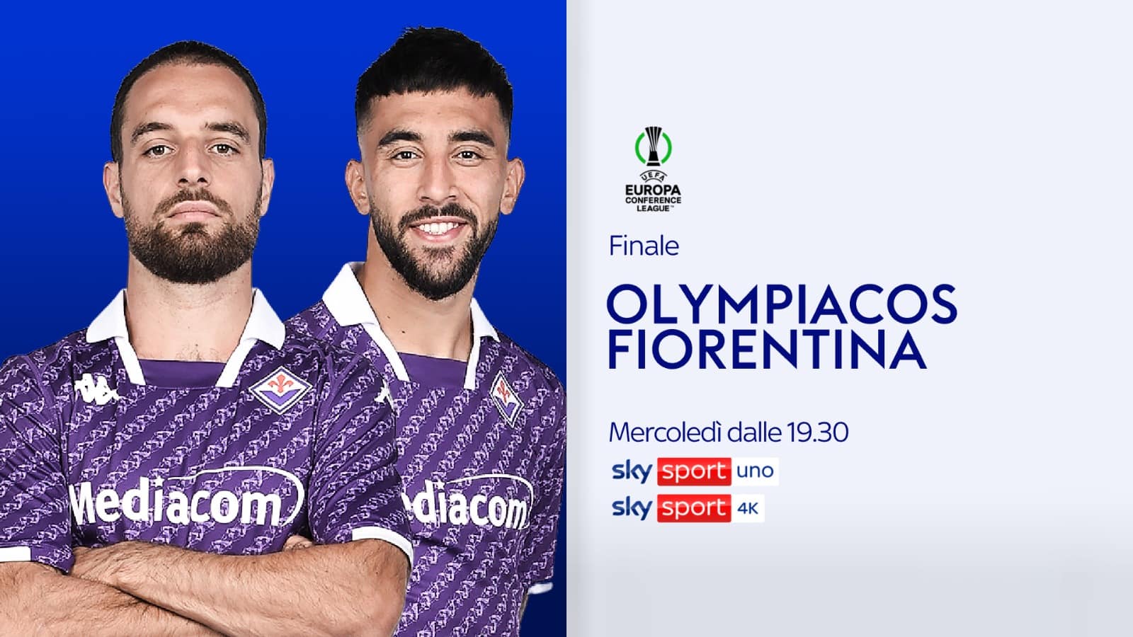 Questa sera, mercoledì 29 maggio, si torna in campo per la finale di Europa Conference League su Sky e in streaming su NOW. Live dall’AEK Arena di Atene, Olympiacos-Fiorentina, che si sfideranno nella finale che assegnerà il secondo trofeo continentale della stagione.