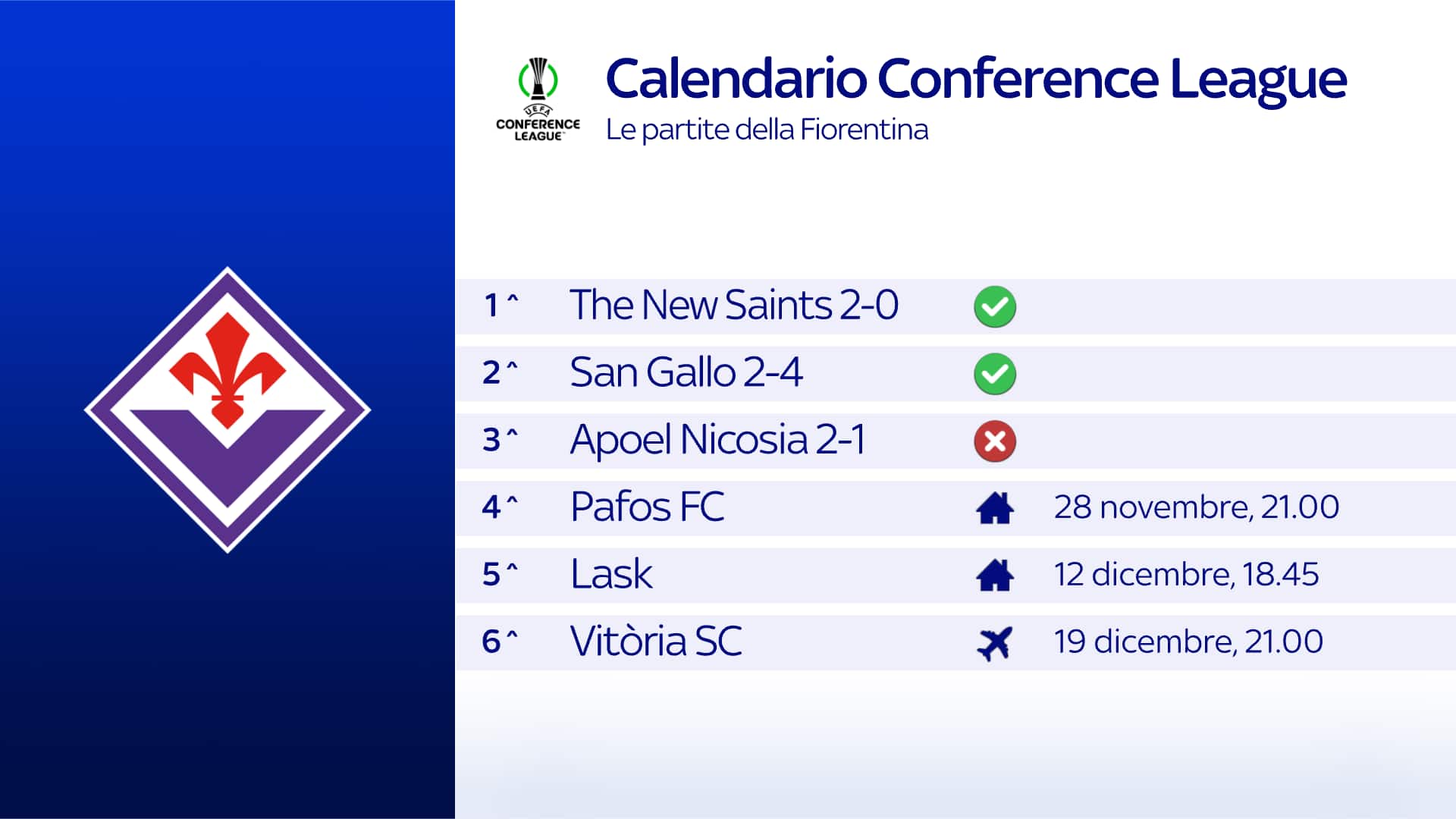 Questo sarà il primo incontro europeo in assoluto tra Fiorentina e Pafos: la Viola affronterà una squadra cipriota solo per la seconda volta nella sua storia in queste competizioni, dopo la sconfitta contro l'APOEL (1-2) nell’ultimo turno di questa UECL; dall’altra parte, per il Pafos sarà la prima sfida contro una squadra italiana. Questo sarà il 28° confronto tra squadre italiane e cipriote in una grande competizione europea, con le formazioni di Cipro che hanno vinto ciascuno degli ultimi due incontri di questo tipo dopo essere rimaste senza vittorie in tutti i primi 25 (6N, 19P). Dopo la sconfitta nell’ultimo turno contro l’APOEL, la Fiorentina potrebbe perdere due match di fila in Conference League solamente per la seconda volta (qualificazioni escluse) nella storia della competizione, dopo aprile-maggio 2023 (contro Lech Poznan e Basilea in quel caso). La Fiorentina è imbattuta da nove partite interne consecutive nelle coppe europee (6V, 3N – qualificazioni incluse) e potrebbe arrivare in doppia cifra di match di fila senza sconfitta davanti al proprio pubblico in queste competizioni per la prima volta dal periodo tra ottobre 2007 e novembre 2008 (esattamente 10 in quel caso – 5V, 5N). Il Pafos ha ottenuto un successo nel suo unico match esterno disputato in questa fase della Conference League (4-1 vs Petrocub-Hincesti alla 1^ giornata) e potrebbe registrare due successi di fila in trasferta nelle coppe europee per la prima volta nella sua storia, dopo aver perso il 100% delle prime quattro partite giocate lontano da casa in queste competizioni (4/4 – qualificazioni incluse).