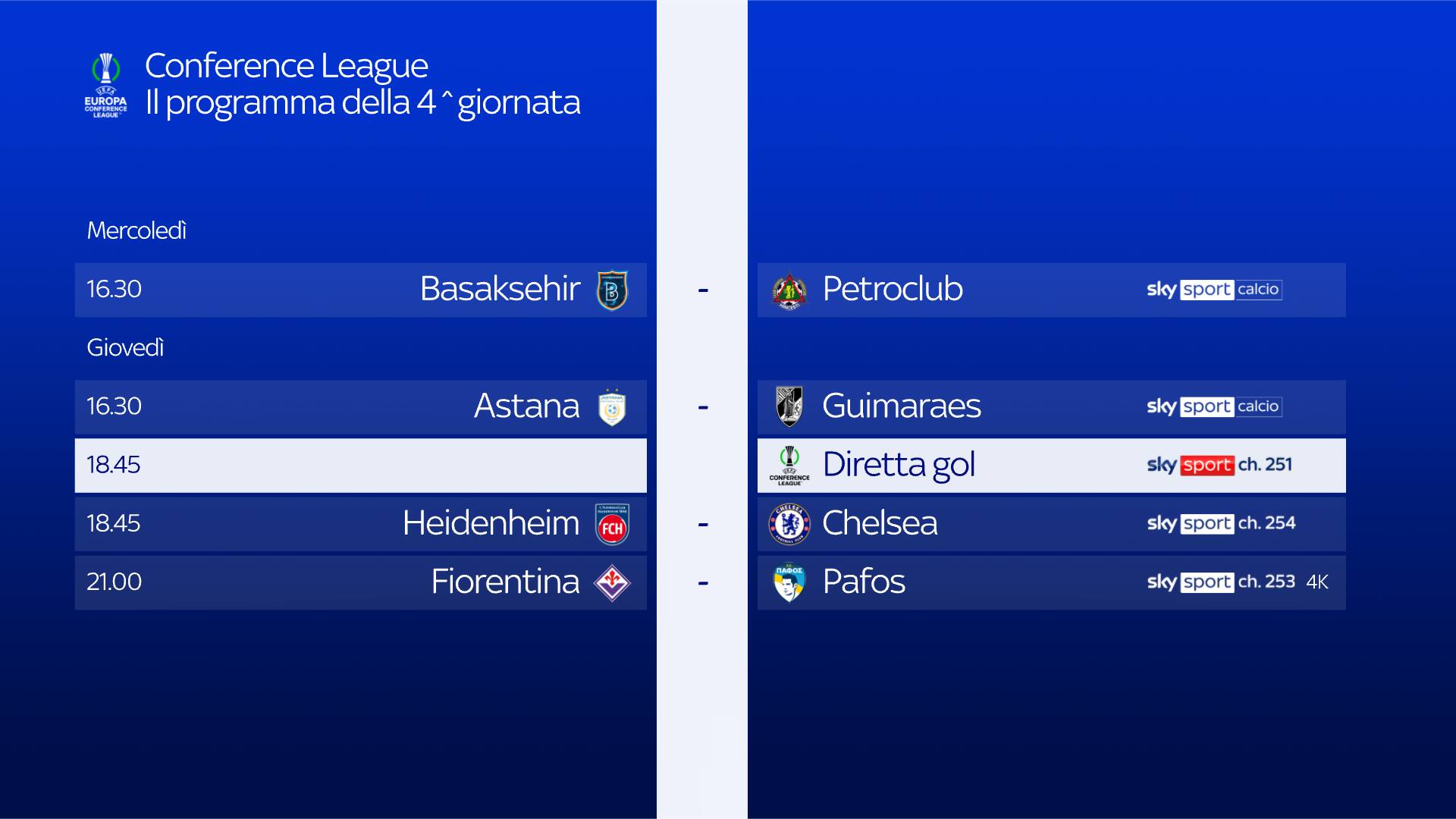 La Fiorentina è impegnata oggi contro i ciprioti del Pafos, match da seguire in diretta alle ore 21, su Sky Sport 253, Sky Sport 4K e in streaming su NOW. Telecronaca affidata a Antonio Nucera, commento Massimo Gobbi, a bordocampo Vanessa Leonardi, Diretta Gol con Dario Massara. Appuntamento inoltre con il prepartita e il post gara- dalle 18, dalle 20 e dalle 23- con lo studio condotto da Mario Giunta in compagnia di Beppe Bergomi, Marco Bucciantini, Andrea Marinozzi e Valeri Bojinov . Spazio news con Vittoria Orlando. Da non perdere Diretta Gol per seguire tutte le partite in contemporanea su Sky Sport 251 e in streaming su NOW.