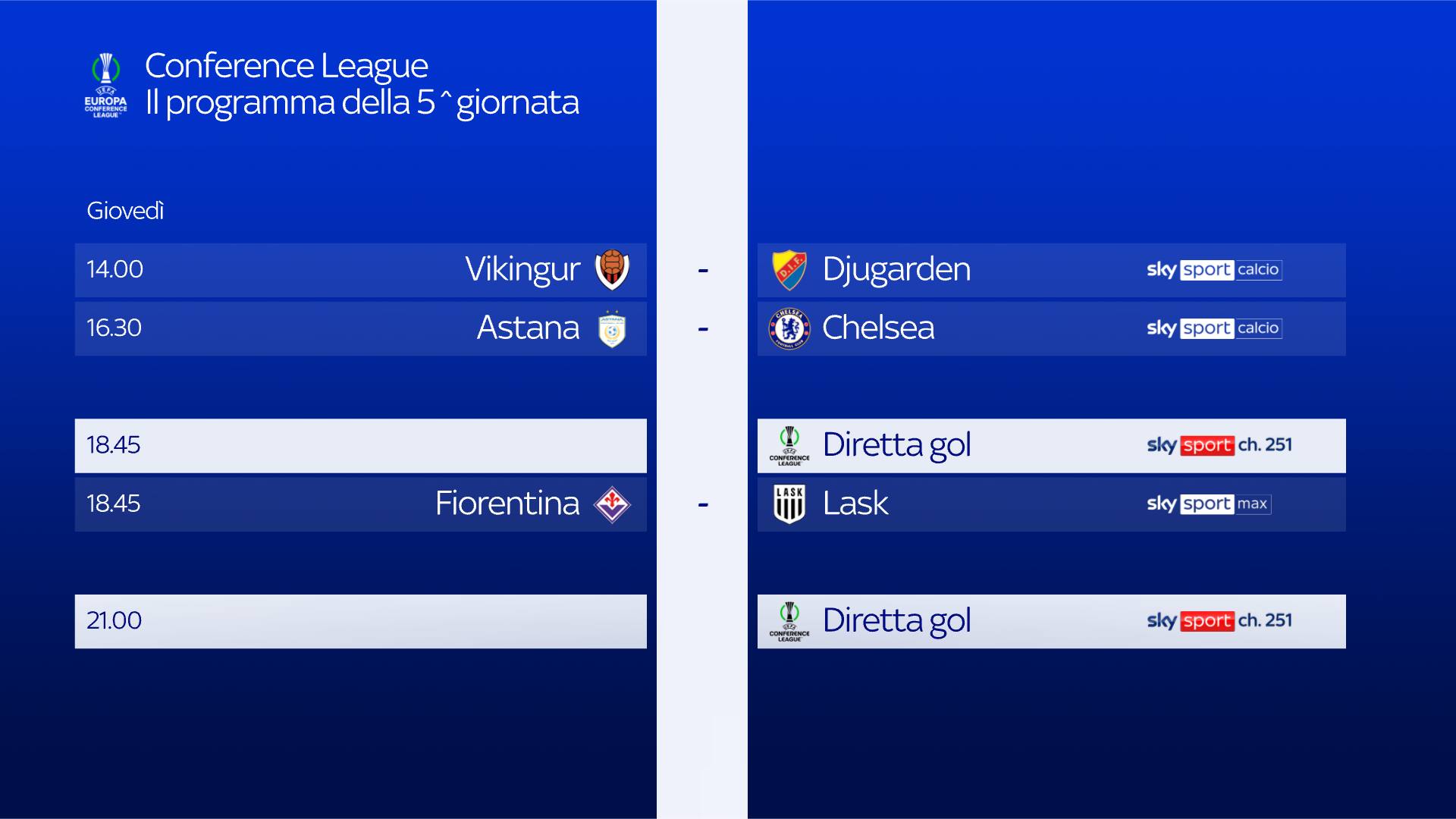 La Fiorentina è impegnata oggi contro gli austriaci del Lask, match da seguire in diretta alle ore 18.45, su Sky Sport Max, Sky Sport 253 e in streaming su NOW. Telecronaca affidata a Daniele Barone, commento Lorenzo Minotti, a bordocampo Vanessa Leonardi; Diretta Gol con Dario Massara. Appuntamento inoltre con il prepartita e il post gara- dalle 18, dalle 20 e dalle 23- con lo studio condotto da Mario Giunta in compagnia di Beppe Bergomi, Marco Bucciantini, Andrea Marinozzi. . Spazio news con Vittoria Orlando. Da non perdere Diretta Gol per seguire tutte le partite in contemporanea su Sky Sport 251 e in streaming su NOW.