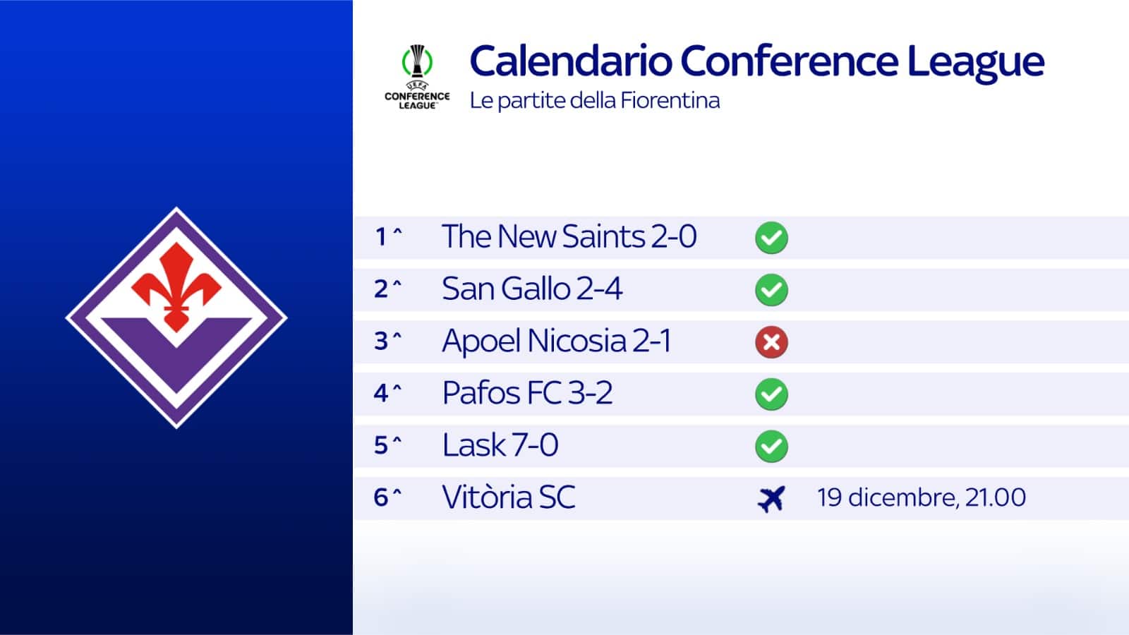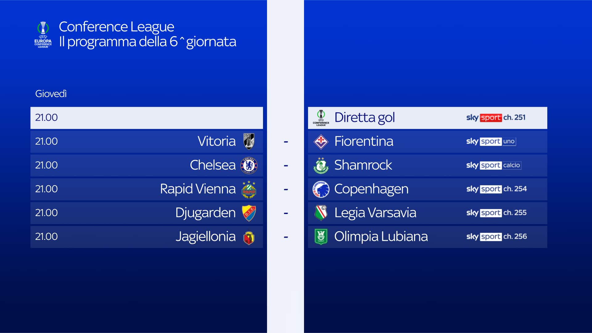 Si torna in campo in Europa per la sesta giornata della “League Phase” di Conference League, tutta da vivere in esclusiva su Sky e in streaming su NOW. Giovedì 19 dicembre in campo tutte le 18 partite, da seguire in contemporanea grazie alla più grande Diretta Gol di sempre, in diretta su Sky Sport 251 e NOW. Per le italiane, in campo alle 21.00 la Fiorentina che sfida la squadra portoghese del Guimaraes su Sky Sport Uno, Sky Sport 252 e NOW.