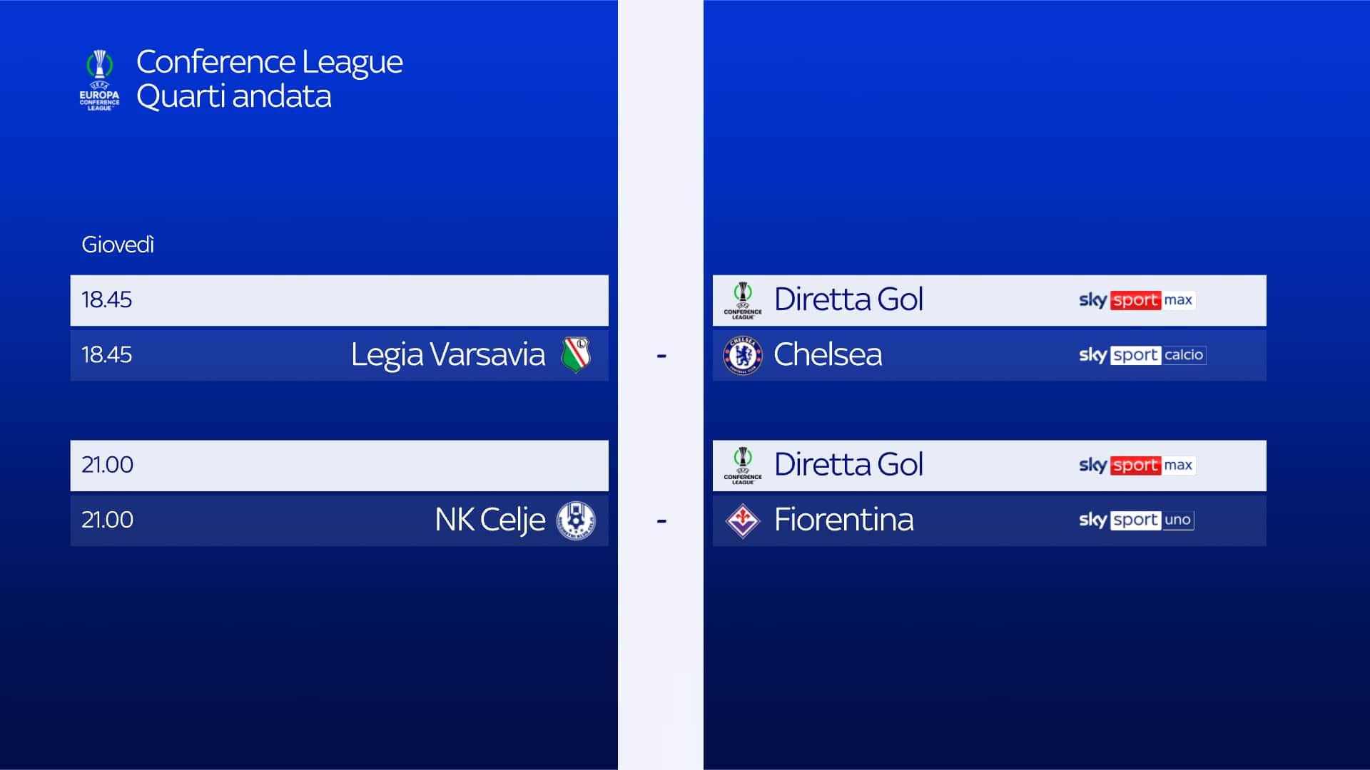 La Fiorentina è impegnata oggi in trasferta contro gli sloveni del Celje, match da seguire in diretta alle ore 21, su Sky Sport Uno, Sky Sport 252 e in streaming su NOW. Telecronaca affidata a Dario Massara, commento di Lorenzo Minotti; a bordocampo Vanessa Leonardi e Marina Presello; Diretta Gol con Paolo Ciarravano. Appuntamento inoltre con il prepartita e il post gara -dalle 20 e dalle 23- con lo studio condotto da Mario Giunta in compagnia di Beppe Bergomi, Marco Bucciantini, Andrea Marinozzi. Spazio news con Vittoria Orlando. Da non perdere inoltre Diretta Gol per seguire tutte le partite in contemporanea su Sky Sport Max, Sky Sport 251 e in streaming su NOW.