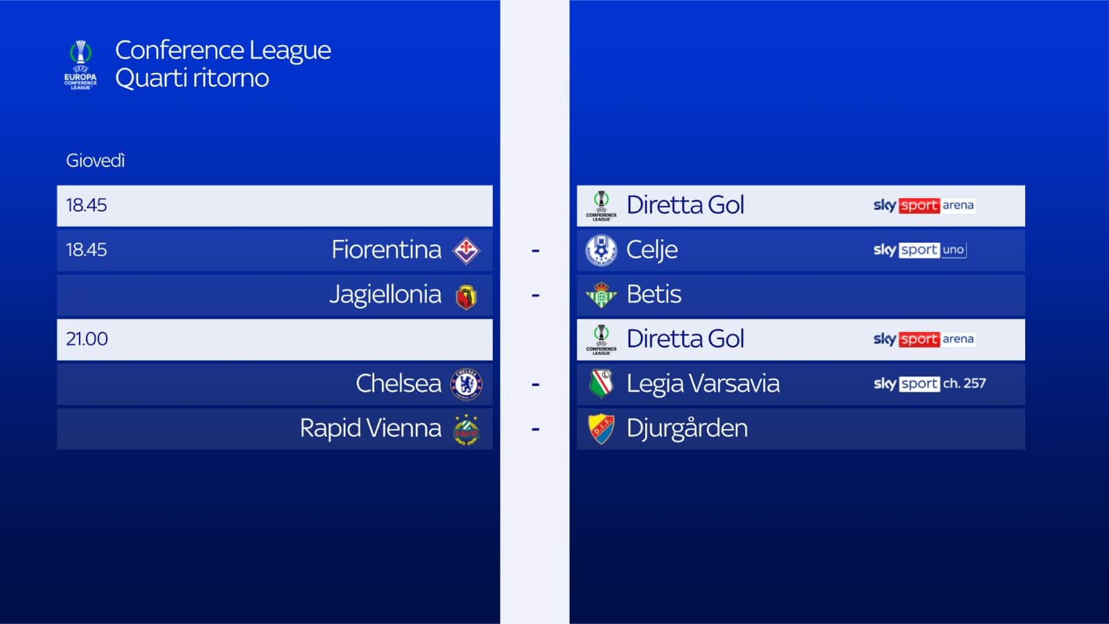 - ore 21.00: CHELSEA-LEGIA VARSAVIA su Sky Sport 257 e in streaming su NOW. Telecronaca Federico Botti, Diretta Gol Matteo Marceddu