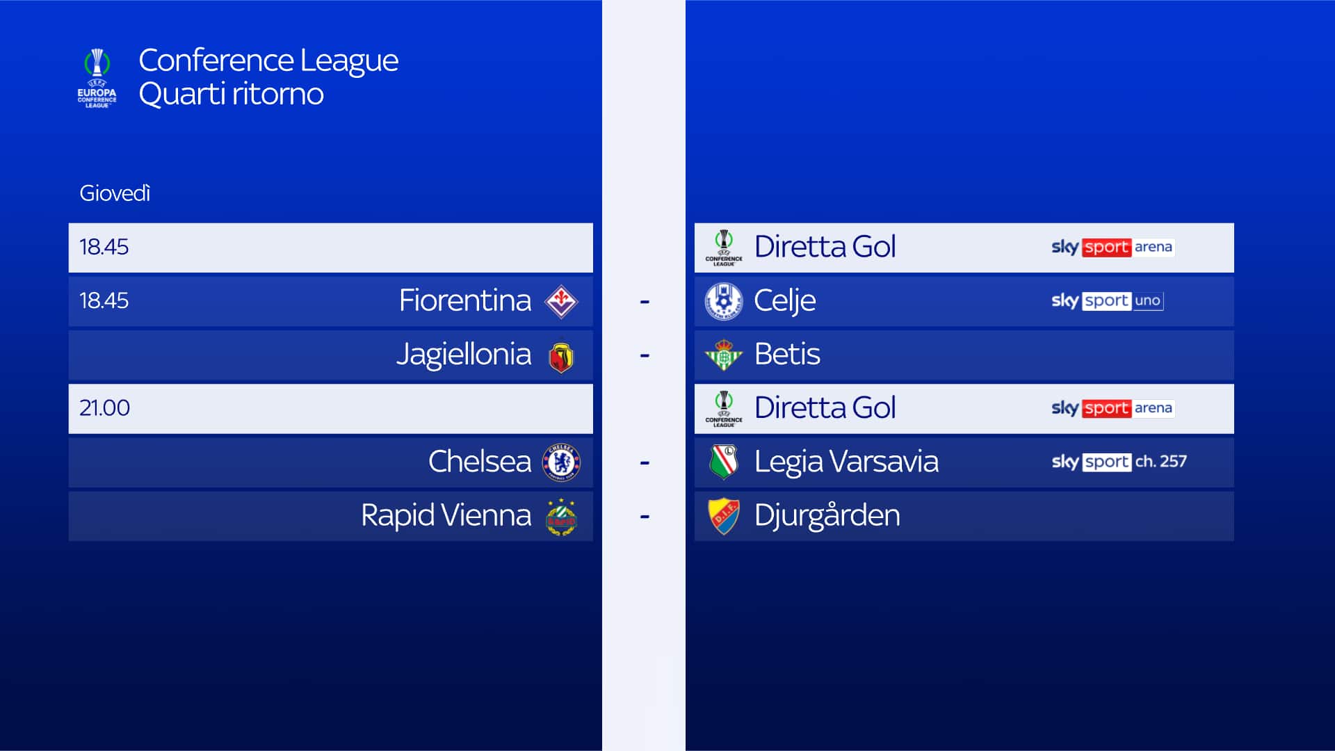 guida tvLa Fiorentina è impegnata stasera in casa contro il Celje, gara valida per il ritorno dei quarti di finale di Conference League. Si gioca alle 18.45 in diretta su Sky Sport Uno, Sky Sport 4K, Sky Sport 253 e in streaming su NOW