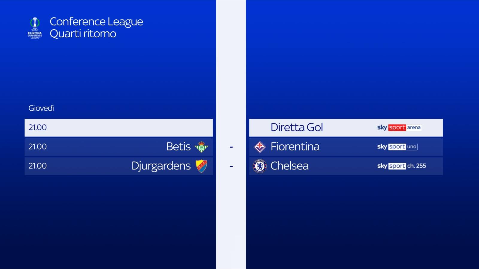 guida tvConference League, le partite di andata delle semifinali su Sky e in streaming su NOW, da seguire anche in contemporanea grazie a Diretta Gol. Alle 21.00 Betis Siviglia-Fiorentina, in diretta su Sky - canali Sky Sport Uno, Sky Sport 252 - e in streaming su NOW. Studi pre e postpartita affidati a Mario Giunta insieme ai suoi ospiti tra cui Beppe Bergomi, Marco Bucciantini e Andrea Marinozzi