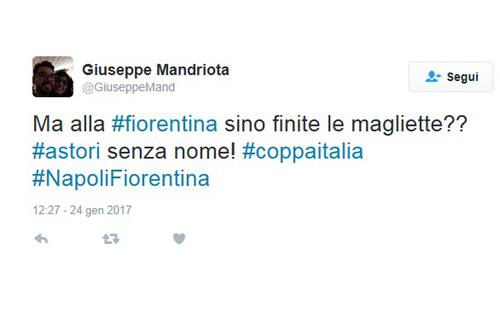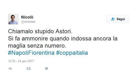 Il motivo? Al 20', dopo uno scontro con Reina, Astori perde sangue dal naso. Seguendo il regolamento, l'arbitro lo invita a uscire dal campo per medicarsi e cambiarsi la maglia sporca. Panico sulla panchina viola: non essendoci una maglia di scorta "Astori 13", il difensore viene rimandato dentro con la divisa bianca che ha scatenato l'ironia dei social