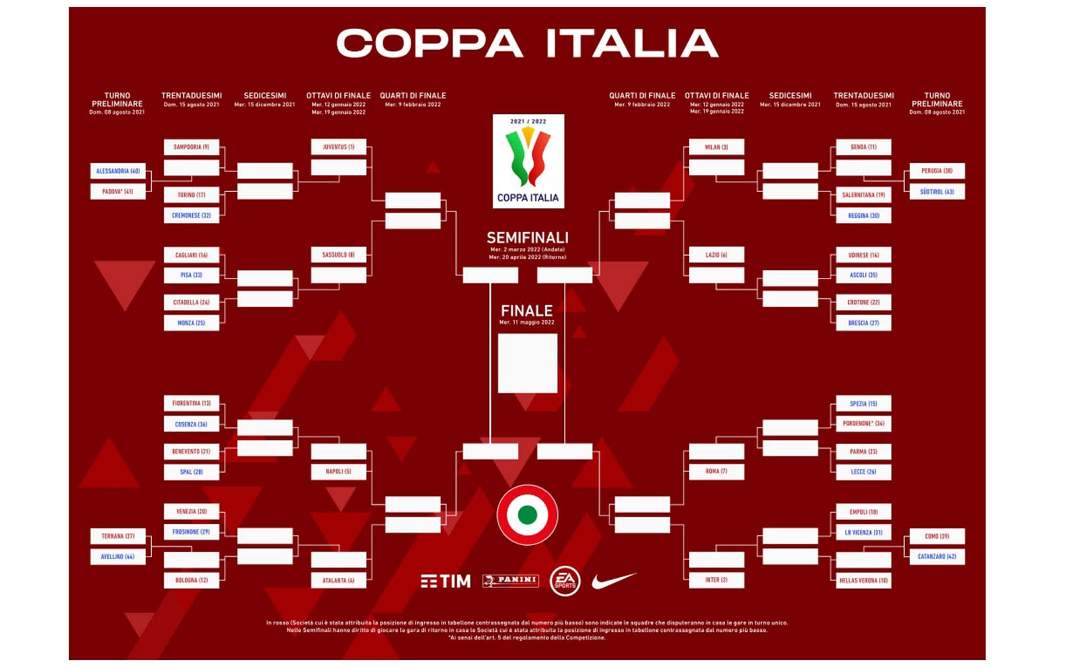 La Lega Serie A ha svelato il tabellone della Coppa Italia 2021/22, la prima edizione con il nuovo format. Ufficializzato il programma dei trentaduesimi, date e orari resi noti fino alla finalissima dell'11 maggio 2022. Stabilita anche la posizione delle big nella griglia a partire dagli ottavi