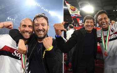 - la gioia del grande tifoso rossoblu Cesare Cremonini, insieme al capitano bolognese Lorenzo De Silvestri