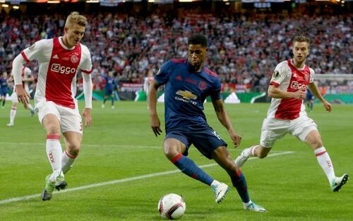 Rashford prova a destreggiarsi fra due difensori dell'Ajax -
