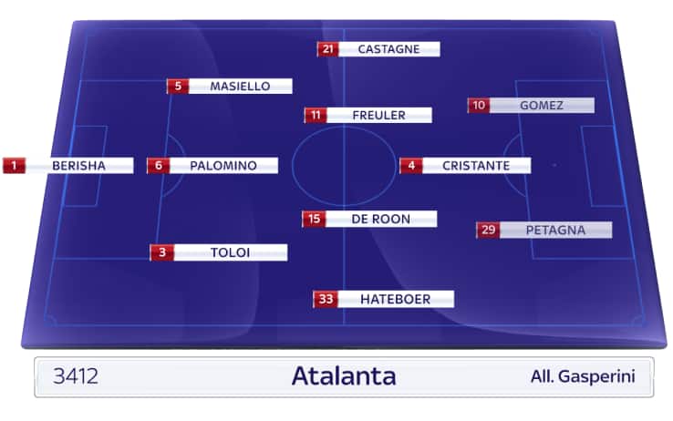 Atalanta(3-5-2): Berisha; Toloi, Palomino, Masiello; Hateboer, Cristante, Freuler, De Roon, Castagne; Gomez, Petagna. Allenatore: Gasperini