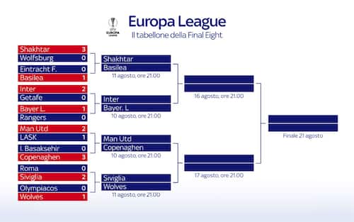 Dopo gli ottavi di finale, la corsa alla finalissima di Europa League ripartirà dalla Final Eight. Incontri in gara secca con otto squadre candidate all'epilogo di Colonia il prossimo 21 agosto: c'è l’Inter di Conte che scenderà in campo lunedì sera contro il Bayer Leverkusen in contemporanea a Manchester United-Copenaghen. Martedì alle 21 toccherà invece a Basilea-Shakhtar e Wolverhampton-Siviglia