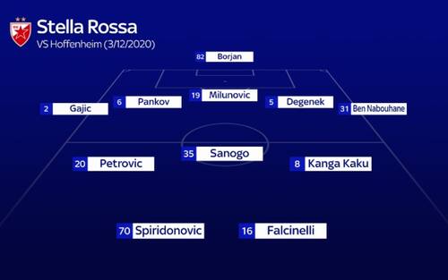 COME GIOCA - Stankovic, soprattutto a inizio avventura con la Stella Rossa (dicembre 2019) prediligeva il 4231, ma di recente ha virato su una difesa a cinque con gli esterni più bassi. Oltre ai nomi degli XI che hanno recentemente sfidato l'Hoffenheim, occhio anche ai rifinitori Ivanic, El Fardou e Katai, i tre migliori marcatori stagionali del club rispettivamente con 11 gol (Ivanic) e 10 gol (El Fardou e Katai). Nel reparto offensivo c'è anche l'ex Atalanta Richmond Boakye (60 reti in 102 partite con la Stella Rossa).