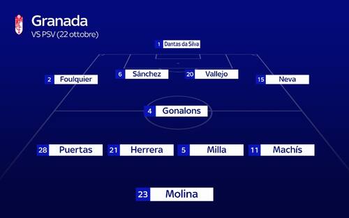 COME GIOCA. Il modulo utilizzato dal Granada è di base un 4-1-4-1 molto compatto e solido ma anche con buona predisposizione a proporre gioco. Gonalons è il baluardo davanti alla difesa, Molina (e Soldado) i terminali offensivi con esterni di gamba e qualità come Machis e Puertas. Da tenere d'occhio il venezuelano Herrera, lui che all'appello risulta tra i giocatori più appetibili sul mercato come il centrale difensivo Duarte e i jolly offensivi Kenedy e Suarez