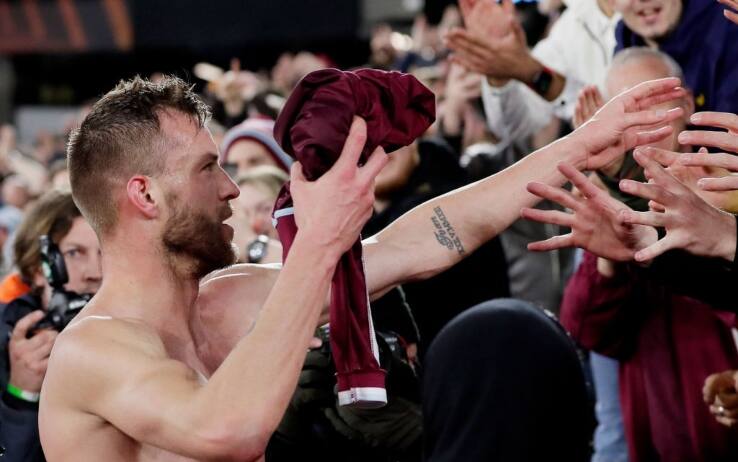 west hamL'attaccante del West Ham e capitano della nazionale ucraina ha deciso il passaggio del turno dei suoi Hammers ai quarti di finale di Europa League con il gol del 2-0 segnato nei supplementari. Dopo la commozione legata anche al difficile momento che sta vivendo il suo paese invaso dalle truppe russe, ha festeggiato insieme ai compagni la vittoria e poi ha voluto fare un regalo speciale a un ragazzo, presumibilmente ucraino, che vestiva una bandiera del paese dell'est europeo