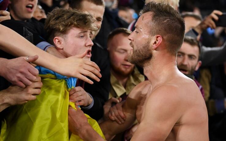 West Ham, Yarmolenko regala la maglia a un tifoso con la bandiera ucraina